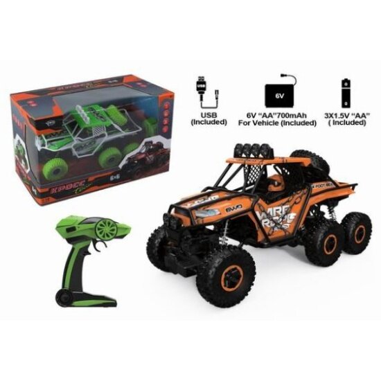 Игрушечная машина-краулер на радиоуправлении выполнена в масштабе 1:16. Игрушка двигается вперёд и назад, поворачивает вправо и влево. Команды задаются нажатием кнопки-спускового крючка на пульте управления или прокручиванием бокового колёсика. Во время игры загораются фары. Машина снабжена 6-ю колёсами на 3-х осях. В кабине есть несъёмная фигурка гонщика. Игрушка работает от аккумулятора АА 700 mAh 6 V, зарядка осуществляется с помощью -устройства (входит в комплект). Пульт работает от 3-х тестовых батареек типа АА на 1,5 V (входят в комплект в демонстрационных целях). Размер машины (ДхШхВ) составляет 34х17х19 см. Материал изготовления: пластмасса. Рекомендованный возраст: 6 лет +