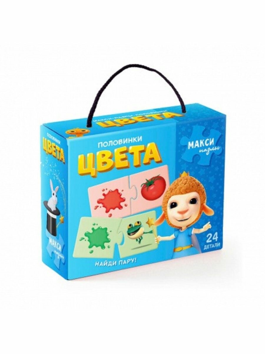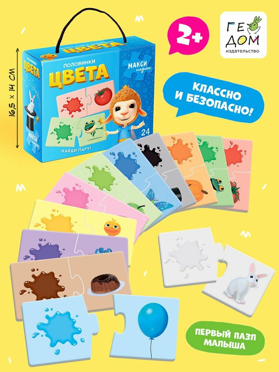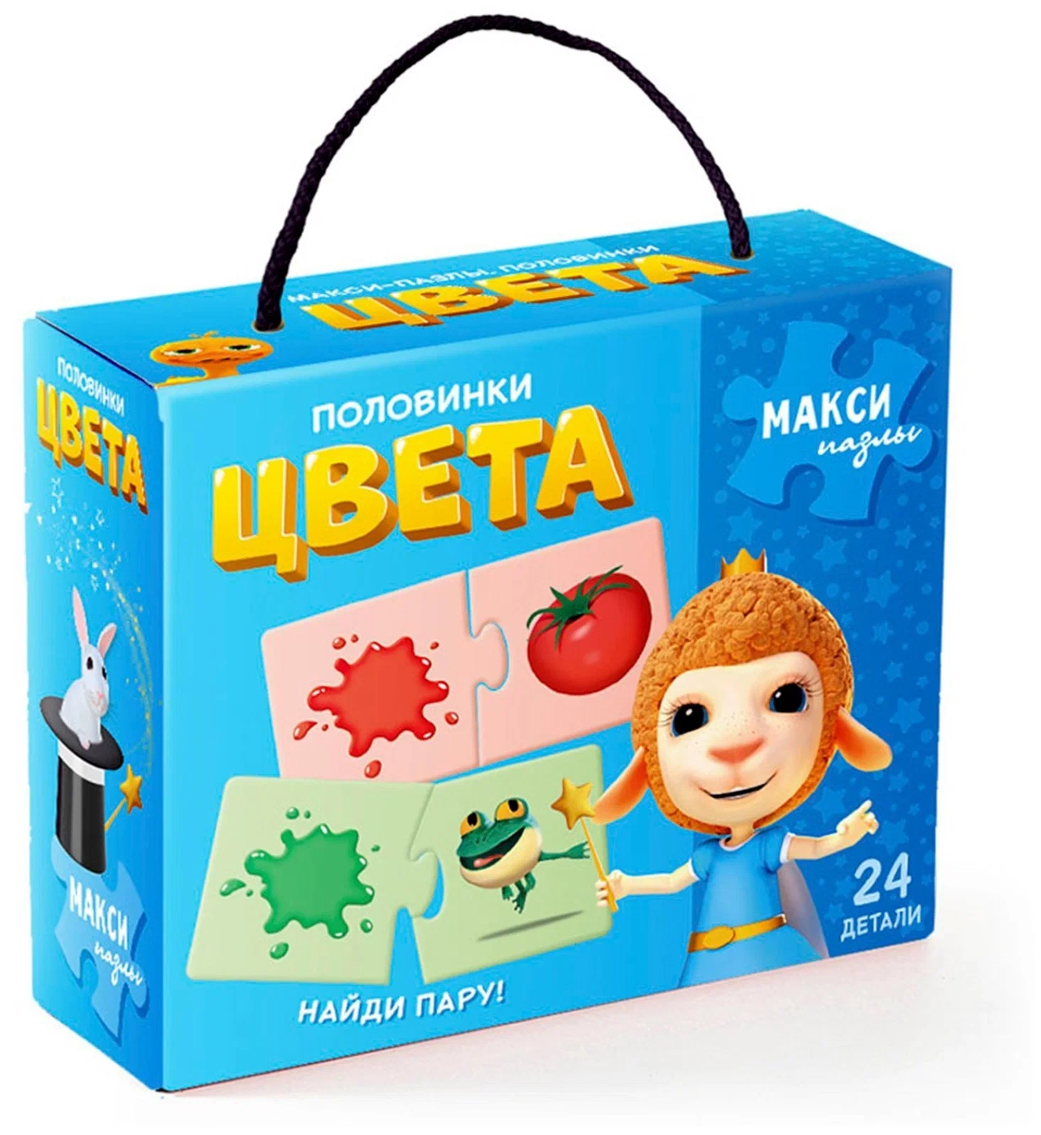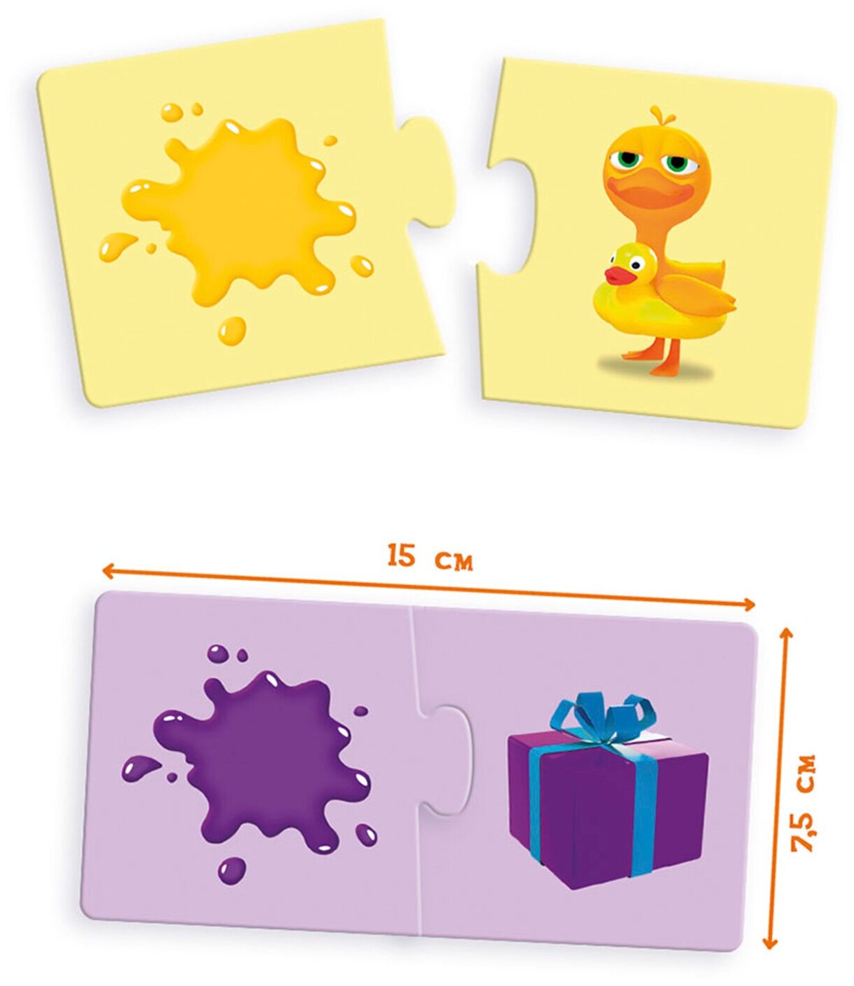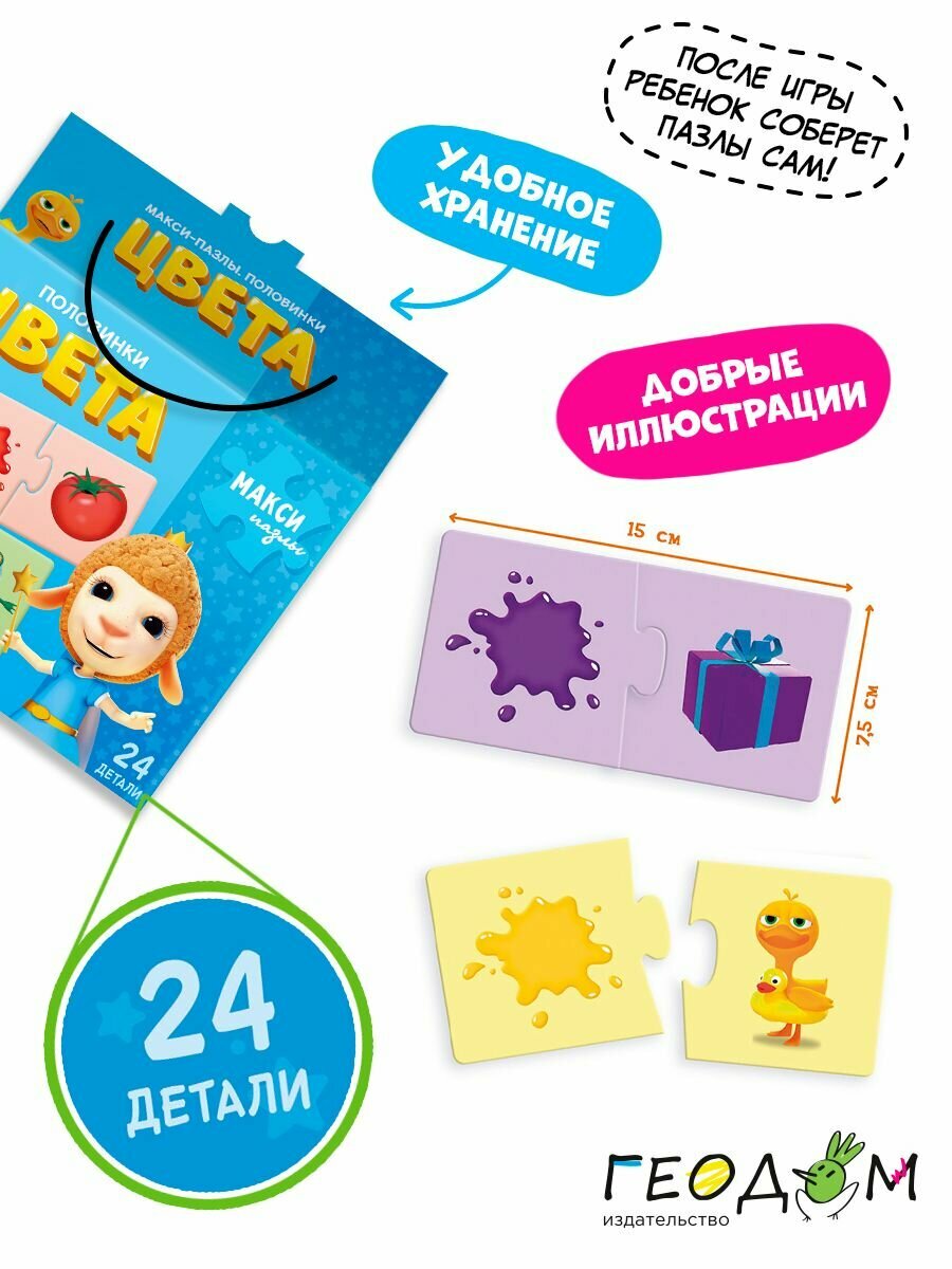 В яркой коробке находится 12 картинок, разделённых на 2 части. Размер одной собранной картинки – 15см*7,5 см. Составлять пазлы из двух половинок легко и увлекательно.