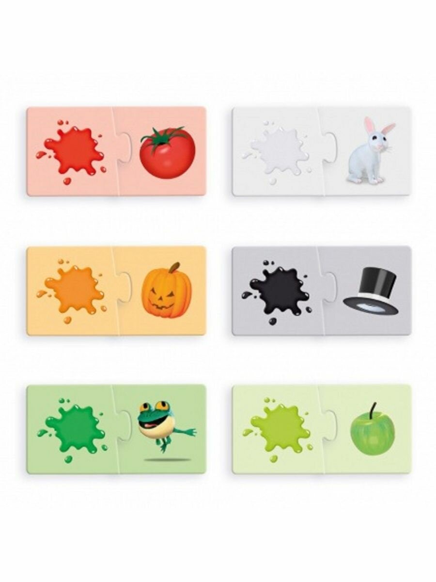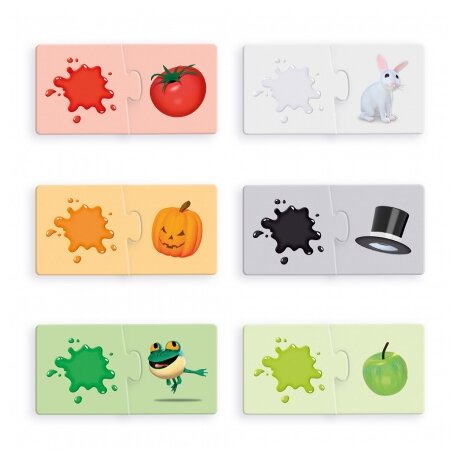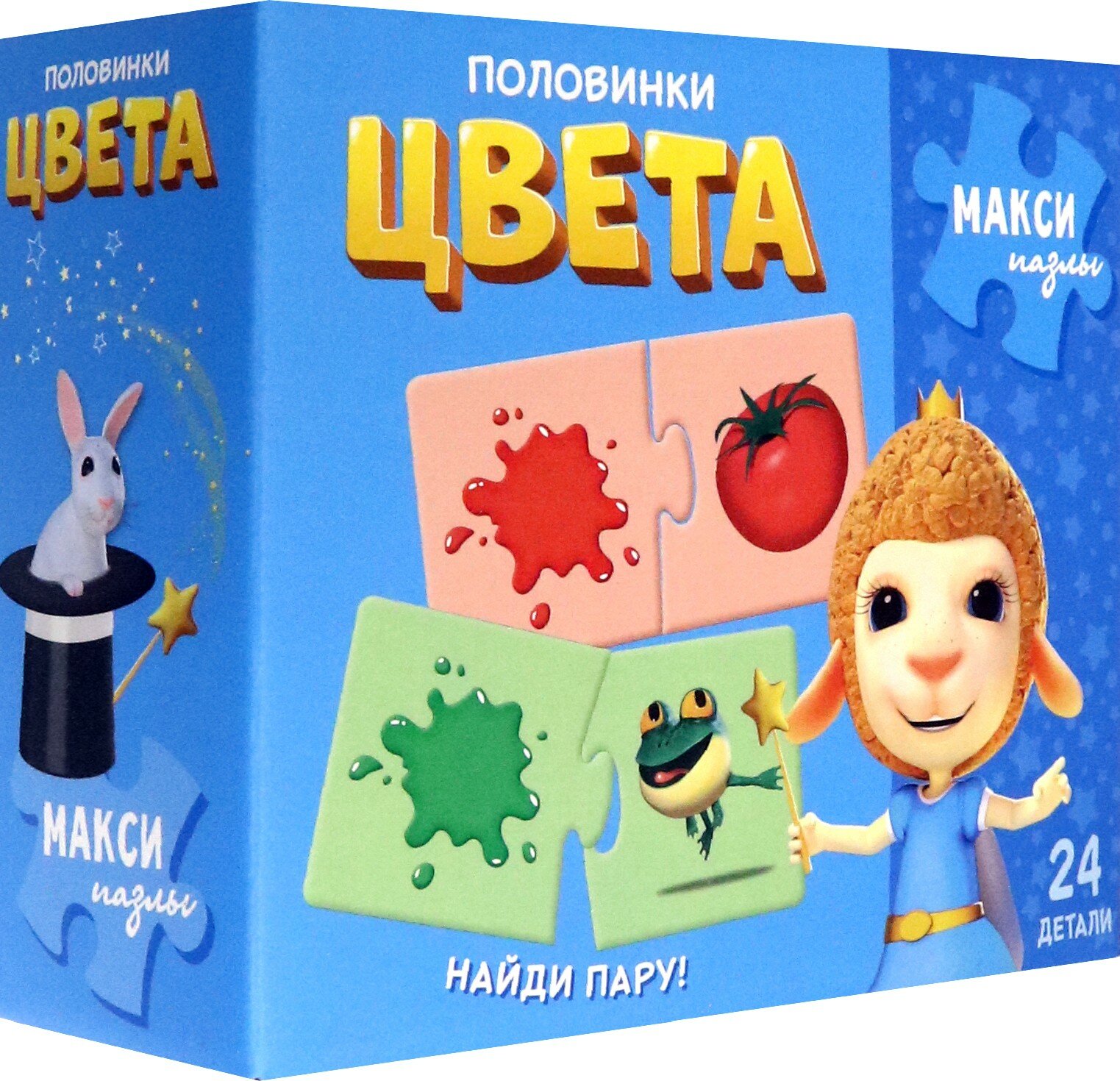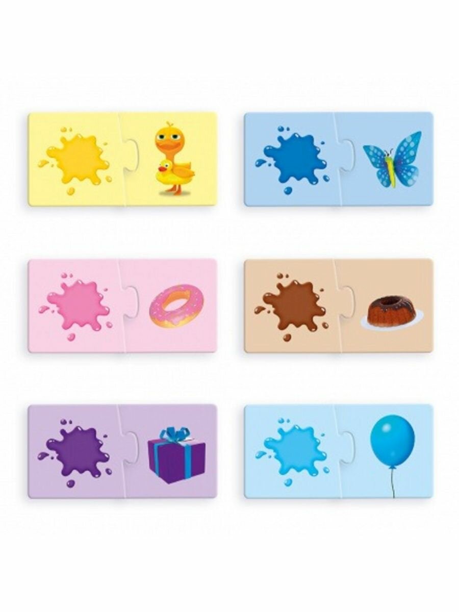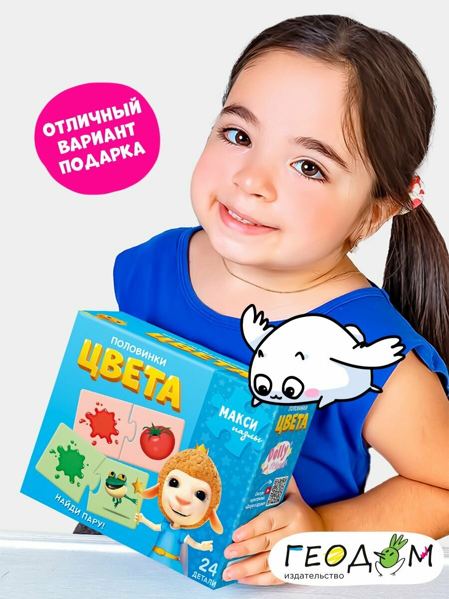 В яркой коробке находится 12 картинок, разделённых на 2 части. Размер одной собранной картинки – 15см*7,5 см. Составлять пазлы из двух половинок легко и увлекательно.