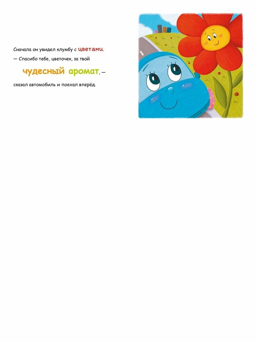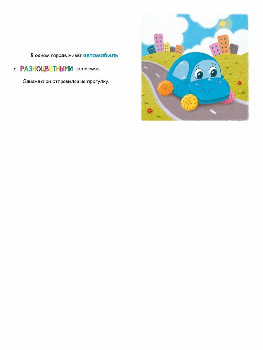 Увлекательная интерактивная книжка-картонка для самых маленьких. Отправляйся на прогулку с автомобилем с разноцветными колёсами. Познакомься с цветами, сосчитай птичек и бабочек и помоги автомобилю перепрыгнуть лужи!