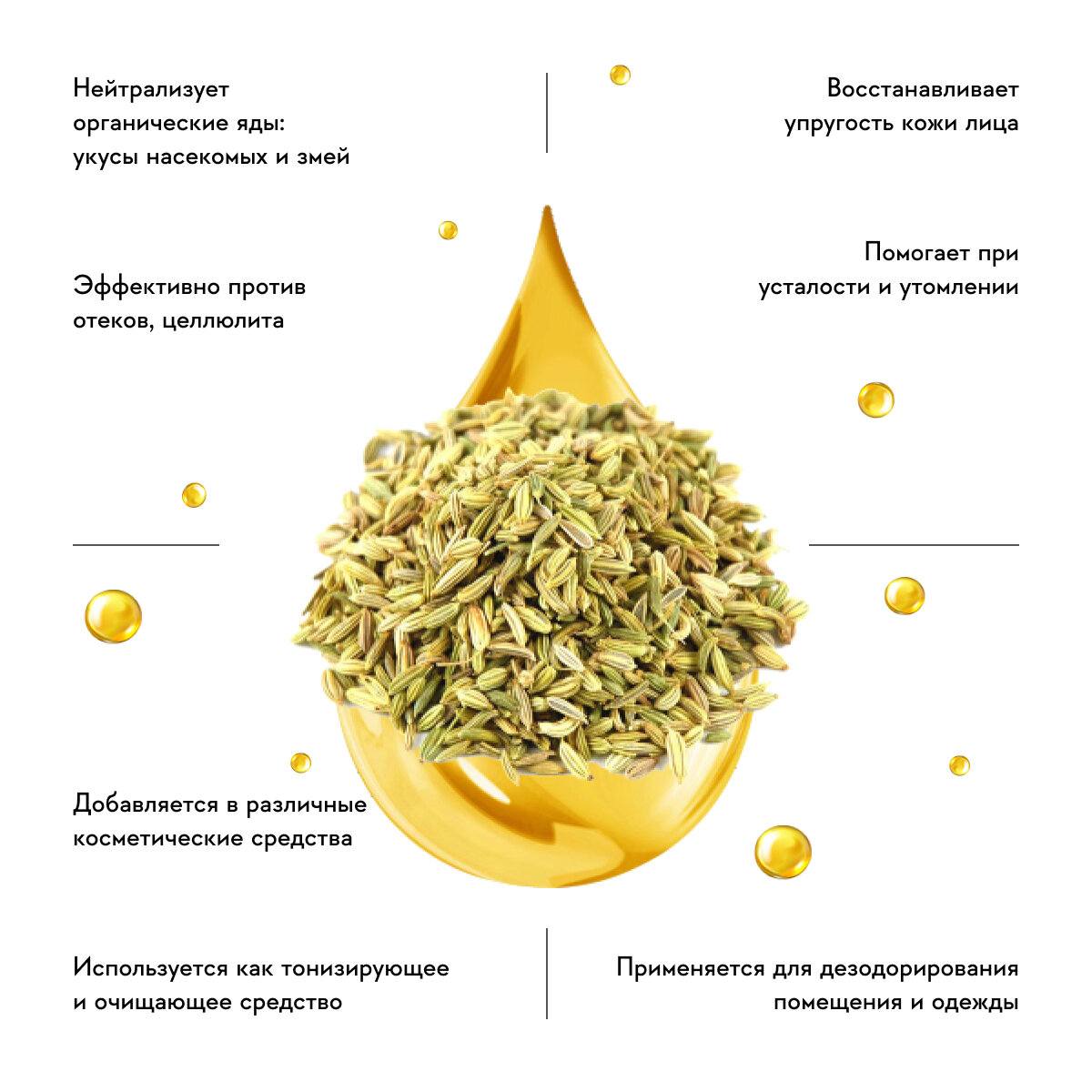 Эфирное масло фенхеля в эмоциональной сфере несет успокаивающее, поддерживающее влияние, оно помогает принимать ситуации и события адекватно, подталкивает к объективному, ясному восприятию и принятию решений. Этот легкий сладкий аромат способствует здравой оценке событий, помогает избавиться от заблуждений и несправедливых оценок. В сфере коммуникаций фенхелевое масло способствует уединению, медитациям, оно устраняет зависимость от общения, чужих мнений и оценок, нейтрализует острую потребность в социальном принятии и одобрении, но при этом также направлено на ликвидацию тревоги, страха, комплексов и предубеждений, неуверенности в своих силах. Лечебные свойства: Это одно из самых активных мочегонных масел, которое помогает справиться с отеками различного происхождения, в том числе и при избыточном весе или нарушении работы почек, а также снимает воспаления при всех инфекционных заболеваниях мочеполовой системы, уретрите и цистите. В качестве профилактики фенхелевое масло предупреждает образование песка и камней в почках и мочевом пузыре. Фенхель уменьшает аппетит, но и на этом его благотворное влияние на работу желудочно-кишечного тракта не исчерпывается: стимулируя пищеварение, он эффективно активизирует переваривание пищи при переедании или чрезмерном употреблении жиров, тонизирует гладкую мускулатуру, снимает тошноту, расстройства кишечника, икоту, колики и метеоризм. Уникальное свойство эфирного масла из фенхеля — нейтрализация токсинов при алкогольных отравлениях. Фенхелевое масло не только облегчает симптомы отравления, но и выступает антидотом никотина и алкоголя, нейтрализует канцерогены. Такое же нейтрализирующее воздействие оно оказывает и на воспаления при артрите и подагре. Успокаивающее, нормализирующее воздействие фенхеля проявляется и при использовании эфирного масла для лечения бронхитов и астм. Одно из наиболее древних направлений использования фенхелевого масла — нормализация работы женской половой системы. Фенхель благотворно влияет на нарушения менструального цикла, в том числе облегчает симптомы предменструального синдрома и менопаузы, снимает неприятные последствия изменений гормонального фона, восстанавливает природный уровень гормонов, увеличивает лактацию у молодых матерей. Применение: Для аромаламп используют до 4 капель фенхелевого масла на одну комнату. Для улучшения характеристик косметики добавляют до 9 капель аромамасла на 15 грамм основы, а вот для массажа — только до 7. Аромаванны с фенхелевым маслом не должны быть горячими, при этом в эмульгаторе разводят не более 6 капель эфирного масла. Для полоскания при ангине на полстакана воды добавляют 5 капель масла, для аппликаций на десны — 3 капли фенхелевого, смешанного с 7 каплями растительного. Также масло фенхеля применяют в холодных компрессах вместе с маслом жожоба, авокадо или макадамии, добавляя на столовую ложку 7 капель фенхеля и пропитывая марлевые салфетки.