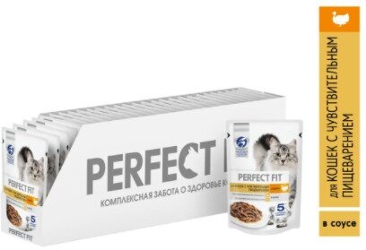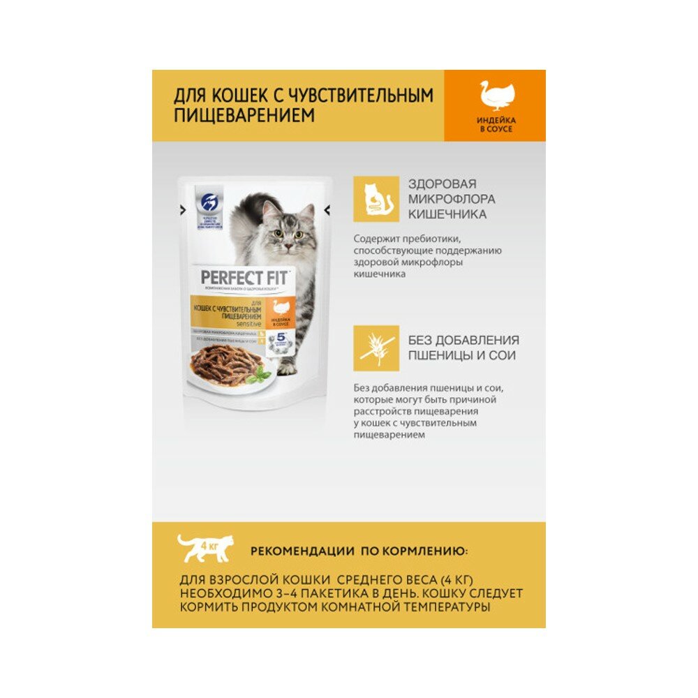 Паучи Перфект Фит для кошек с Чувствительным пищеварением Индейка в соусе (цена за упаковку) - Perfect Fit Sensitive – рацион, адаптированный специально для кошек с особенностями пищеварения. Он содержит пребиотики, способствующие поддержанию здоровой микрофлоры кишечника, и не содержит пшеницы и сои, которые могут вызвать дискомфорт в желудке кошки.Вашу кошку следует кормить кормом комнатной температуры. Для взрослой кошки среднего веса (4кг) необходимо 3-4 пакетика в день.Мясо и субпродукты (в том числе индейка минимум 4%), злаки и продукты их переработки (рис, минимум 4%), растительное масло, таурин, витамины, минеральные вещества. белки – 8,0 г, жиры – 5,5 г, зола – 2,6 г, клетчатка – 0,5 г, витамин А – не менее 200 МЕ, витамин Е – не менее 2,0 мг, влага 80 г.Хранить при температуре от + 4°С до + 35°С и относительной влажности воздуха не более 75 %.