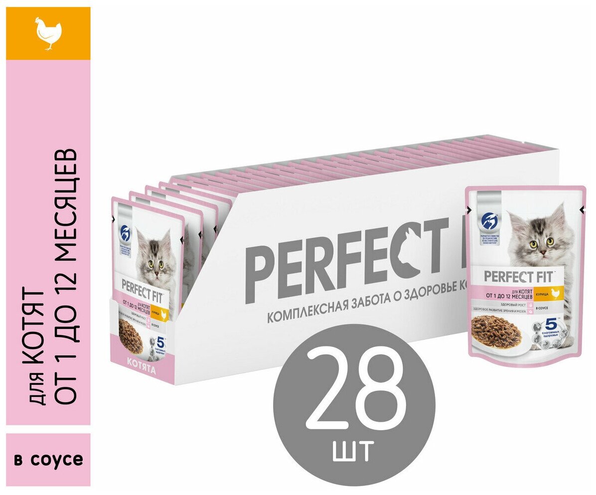 Влажный корм в паучах Perfect Fit с курицей в соусе для котят разработан с учетом потребностей молодого растущего организма. Здоровый рост - сбалансированный корм для здорового роста и развития котенка. Здоровое развитие зрения и мозга - помогает поддерживать зрение и здоровое развитие мозга благодаря содержанию ДГК из натуральных источников.
