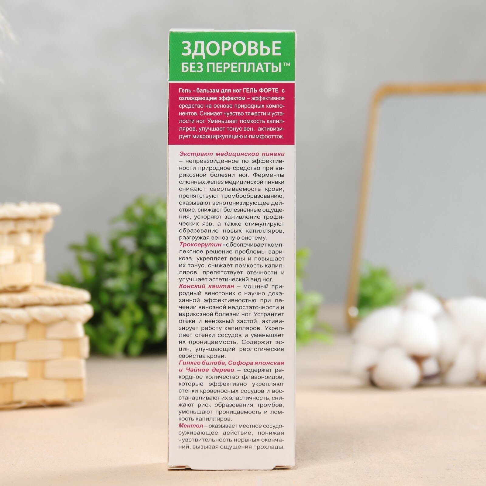 | Состав | Вода, глицерин, карбомер, коко-каприлат/капрат, дикаприлиловый эфир, ментол, троксерутин, экстракт винограда, экстракт каштана конского, гидролизат коллагена, масляные экстракты ромашки, софоры японской, хвоща, шиповника, пропиленгликолевые экстракты алоэ, арники, багульника, березы, гинкго билоба, чая зеленого, бадяги, Д-пантенол, масло хлопковое, масло лесного ореха, масло облепихи, пиявит / экстракт пиявки, витанол, масло эфирное чайного дерева, эфирное масло лимона, феноксиэтанол, этилгексилглицерин, гидроксид натрия, динатриевая соль ЭДТА, лимонен |