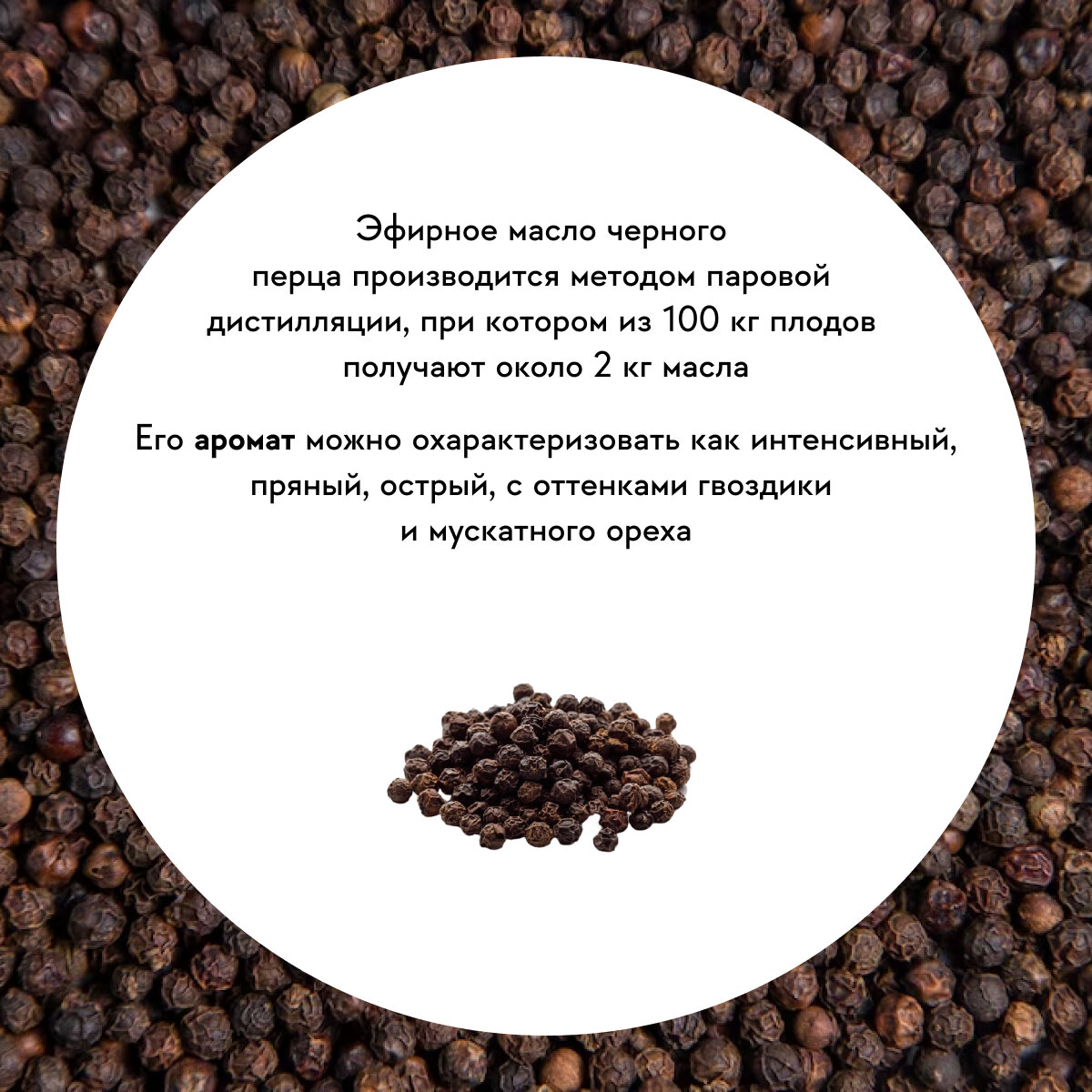 Черный перец является одной из наиболее широко используемых специй в мире. Черный перец ценится не только как приправа для блюд, но и за множество других полезных свойств. Эфирное масло черного перца получают методом паровой дистилляции измельченных незрелых плодов растения черного перца . Эфирное масло содержит органические соединения: а-туйен, а-пинен, камфен, сабинен, (3-пинен, мирцен, а-фелландрен, лимонен, линалоол, терпинен-4-ол, б-элемен, 3-кариофиллен). Эфирное масло легкое, текучее. Цвет масла от бесцветного до желтоватого, желтовато-зеленого. Аромат острый, пряный.