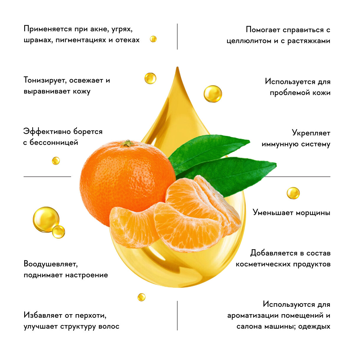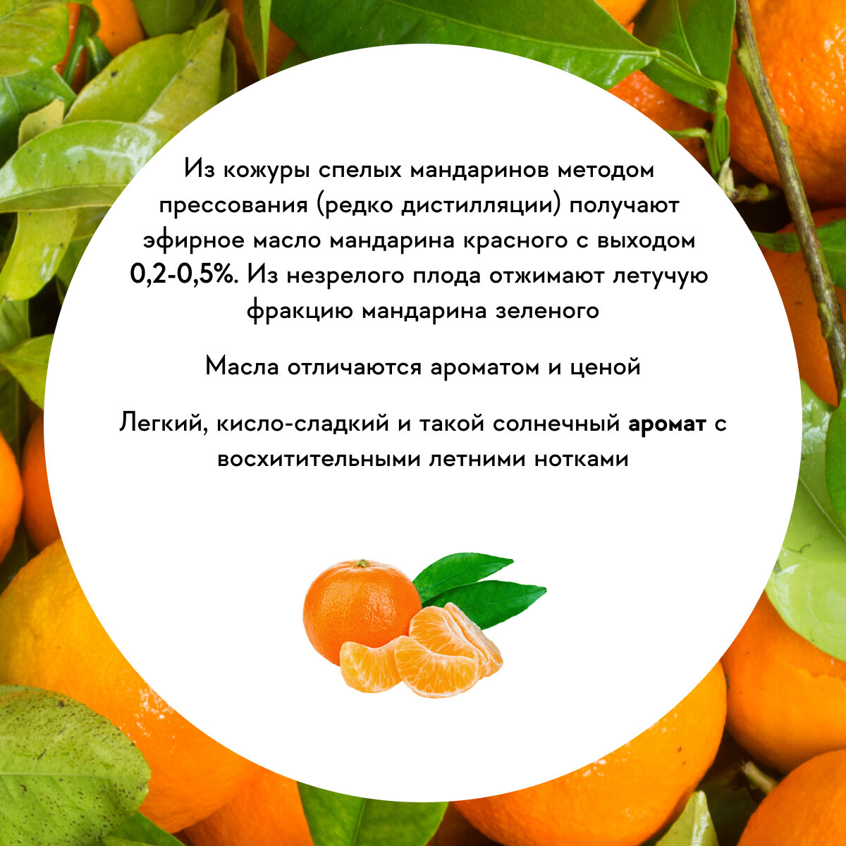 Мандарин – плод вечнозеленого растения. Основные производители этих цитрусовых: Испания, Марокко и Турция. Также мандарины выращиваются в южной Франции, Японии и Индокитае. Яркая оранжевая кожура фруктов имеет насыщенный цитрусовый запах. Сильный аромат плодов мандарина отличает его от других цитрусовых, а мякоть обычно слаще мякоти апельсина. Мандарин является одним из самых солнечных фруктов на земле, а добываемое из спелых оранжевых плодов ароматное эфирное масло обладает чудодейственными свойствами. Аромат мандарина свежий, сладкий, цитрусовый, яркий, фруктово-цветочный и праздничный. Для многих он ассоциируется с детством. Запах мандаринов поднимает настроение не только тому, кто находится в мандариновом облаке, но и всем окружающим. Масло мандарина производят путем холодного прессования, что позволяет сохранить все полезные свойства фруктов. Оно широко применяется в медицине и в том числе в косметологии, в парфюмерной и пищевой промышленности. Масло мандарина содержит кислоты, витамины А, D, К, а также минералы: калий, магний, железо, фосфор, натрий, кальций, фитонциды, природные антисептики. В кожуре содержится примерно 1-2% эфирного масла. Действие эфирного масла мандарина:· положительно воздействует на дыхательную систему, облегчает состояние при затяжной пневмонии, хроническом бронхите;· способствует разжижению и выводу мокроты из легких;· понижает артериальное давление;· способствует удалению растяжек (стрий), делает менее заметными рубцы и шрамы;· убирает жирный блеск кожи;· способствует устранению угревой сыпи и пигментных пятен;· стимулирует умственную и физическую активность, повышает настроение;· помогает справиться с депрессией и бессонницей.
