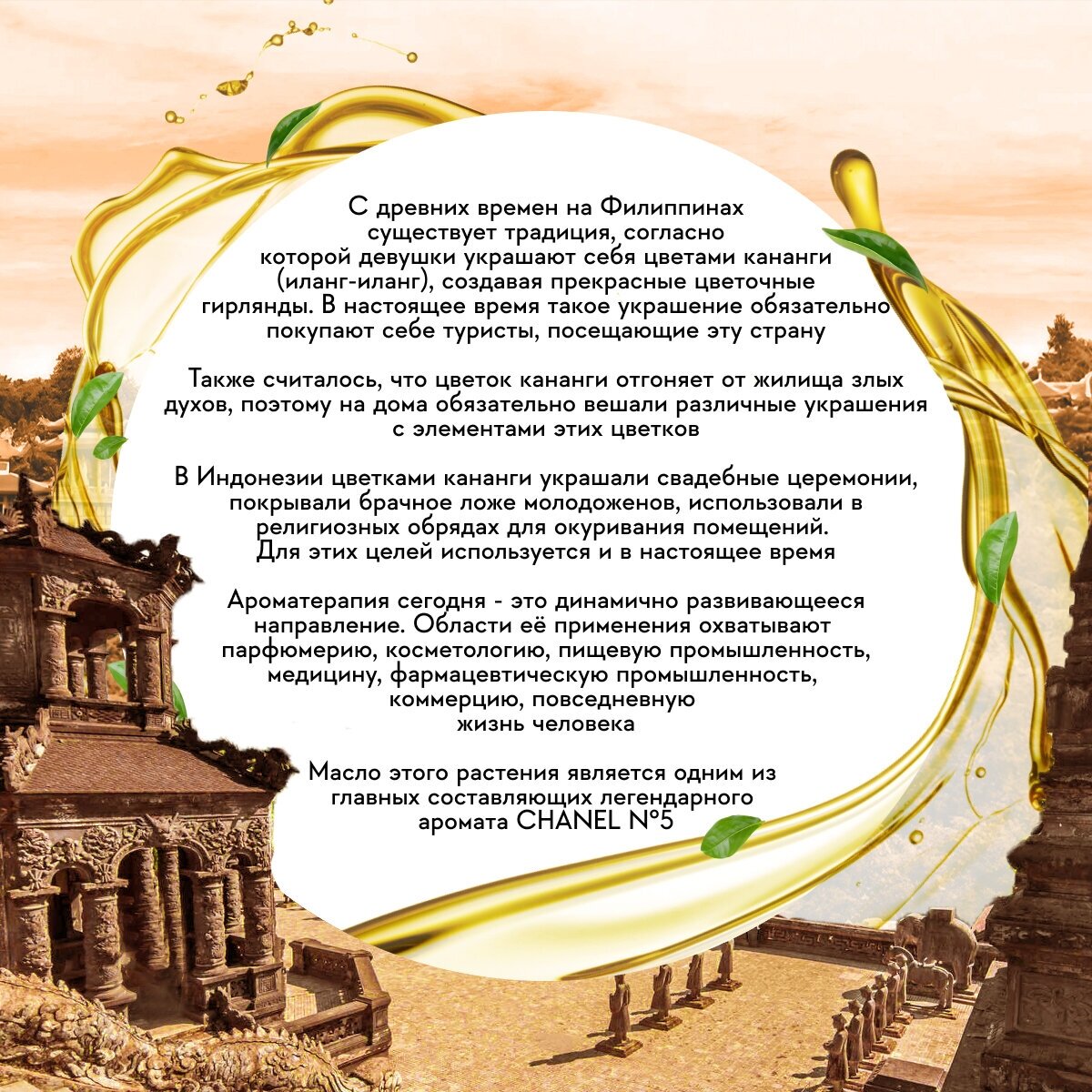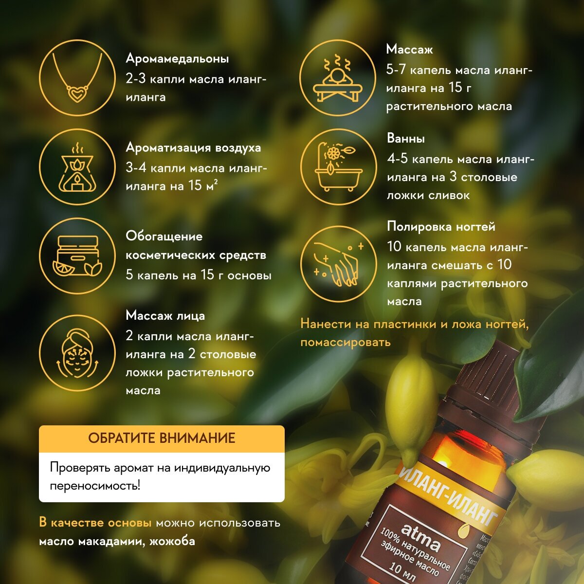 Иланг-иланг произрастает на Мадагаскаре, в Индонезии и Филиппинах. Название этого растения с филиппинского наречия переводится как «цветок всех цветков». Цветки этого растения источают сладкий, густой аромат, который буквально обволакивает дерево в радиусе нескольких метров. Благоухающими венками из иланг-иланга на Мадагаскаре до сих пор украшают молодые пары, а ароматическим дымом с ароматом иланг-иланга окуривают жилище для защиты от ссор и разлада. Эфирное масло иланг-иланга используют в парфюмерии, косметологии, ароматерапии и народной медицине во всех странах мира. Также масло этого растения является одним из главных составляющих легендарного аромата CHANEL N°5. Пудрово-цветочный аромат этих духов с чувственным шлейфом давно стал бестселлером в мире парфюмерии. В составе эфирного масла иланг-иланга – лимонен, гераниол, кариофиллен, альфа-пинен, коричный альдегид, простые и сложные эфиры, оксиды, сафрол, терпинол, валериановая, муравьиная, бензойная и уксусная кислоты. Действие эфирного масла иланг-иланга:оказывает бактерицидное и антисептическое действие;понижает артериальное давление;устраняет головные боли;активизирует иммунную систему организма;положительно воздействует на сердечно-сосудистую систему организма;повышает мышечный тонус;способствует расслаблению, успокаивает нервную систему;укрепляет ногти;борется с кожными заболеваниями, стимулирует рост волос;возвращает коже упругость и молодость.