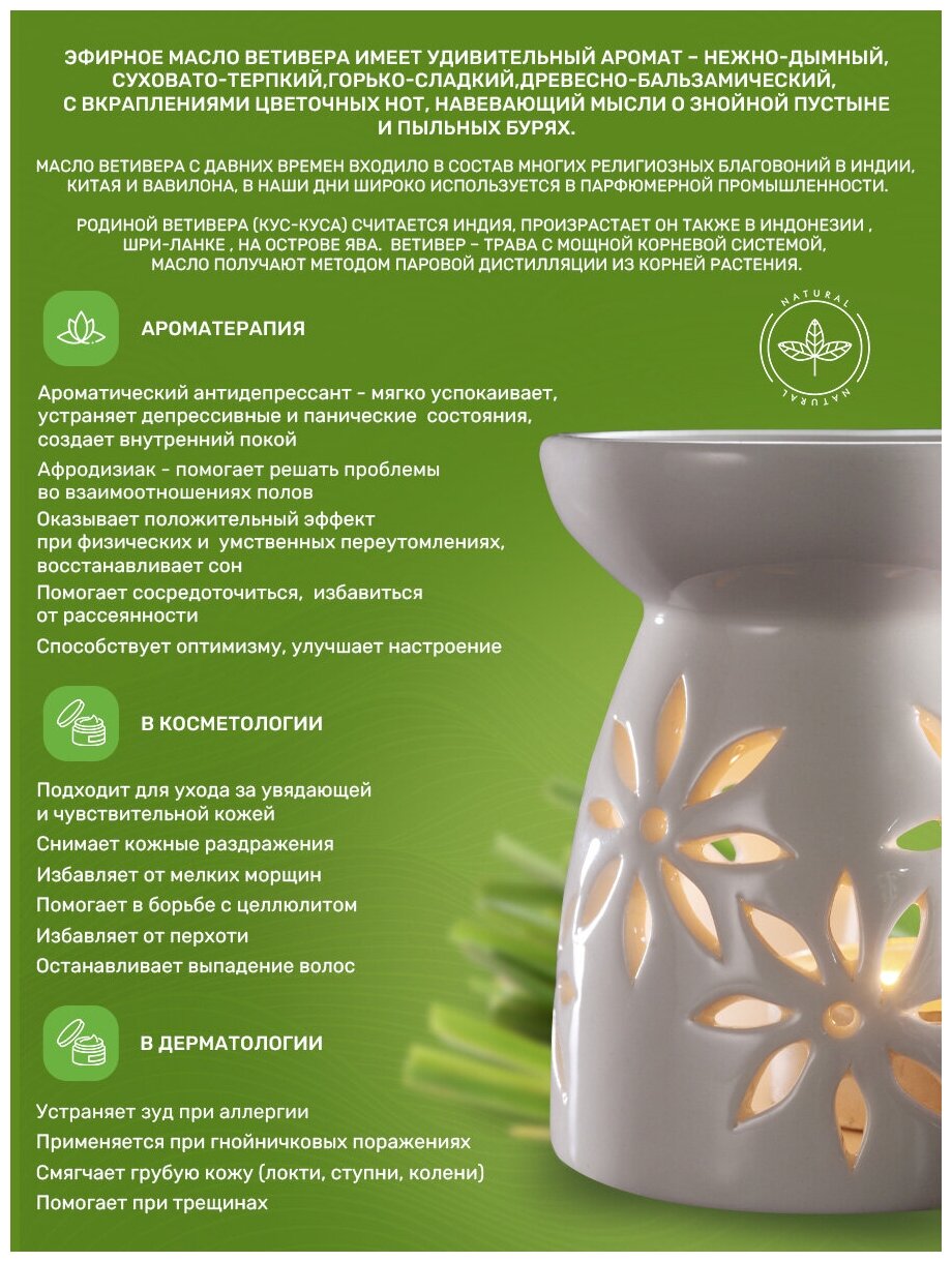 Эфирное масло ветивера - полезный растительный экстракт, обладающий целым спектром полезных для здоровья свойств. Эфирное масло получают посредством паровой дистилляции. Процесс выработки жидкости довольно длительный и трудоёмкий. Корни растения выращиваются в течение двух лет, затем собирают, промывают, высушивают, мелко нарезают и вымачивают. Ароматическая эссенция характеризуется янтарным или тёмно-коричневым цветом. Имеет сладкий землистый аромат с нотками древесины. Масло используется в ароматерапии еще с давних времен. Его аромат расслабляет и успокаивает нервы. Средство является основным ингредиентом в более чем трети всех западных парфюмов и 20% всех мужских ароматов.Действие:• придает престижный аромат духам;• борется с депрессивным синдромом;• улучшает настроение, способствуя оптимизму;• снимает эффективно осиплость голоса;• масло наносят на кожу для заживления ран, устранения шрамов, быстрой регенерации клеток при акне, ожогах, растяжках , оно предотвращает сепсис, останавливая рост золотистого стафилококка; • издавна используется при тепловых ударах, лихорадке, головных болях; Масло ветивера защищает от малярии, лихорадки денге и жёлтой лихорадки. Оно незаменимо, если вы находитесь в тропической зоне.