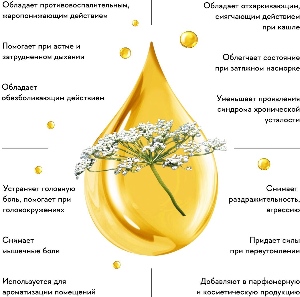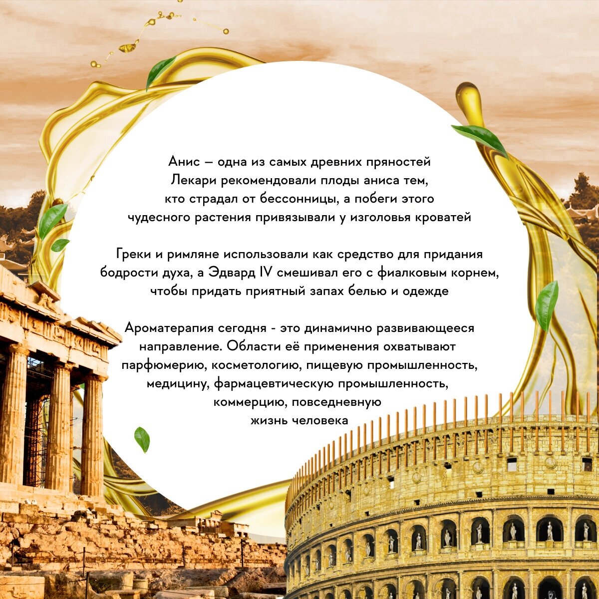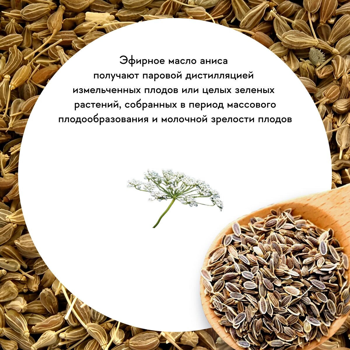 Эфирное масло аниса получают паровой дистилляцией измельченных плодов или целых зеленых растений, собранных в период массового плодообразования и молочной зрелости плодов. Оно имеет приятный характерный аромат. Из макроэлементов в составе эфирного масла аниса в значительных количествах присутствуют калий, кальций и магний, а из микроэлементов – медь, цинк и марганец. Анис – одна из самых древних пряностей, которую получали из одноименного травянистого растения и использовали не только для улучшения вкуса пищи, но и во врачевании. Лекари рекомендовали плоды аниса тем, кто страдал от бессонницы, а побеги этого чудесного растения привязывали у изголовья кроватей. Также анис широко использовали для чистки зубов.Действие эфирного масла аниса:обладает противовоспалительным, антисептическим, жаропонижающим действием;устраняет головную боль, помогает при головокружениях;обладает отхаркивающим, смягчающим действием при кашле, помогает при астме и затрудненном дыхании;облегчает состояние при затяжном насморке;обладает обезболивающим действием; снимает мышечные боли;снимает раздражительность, агрессию и чрезмерную возбудимость;придает силы при переутомлении и уменьшает проявления синдрома хронической усталости.