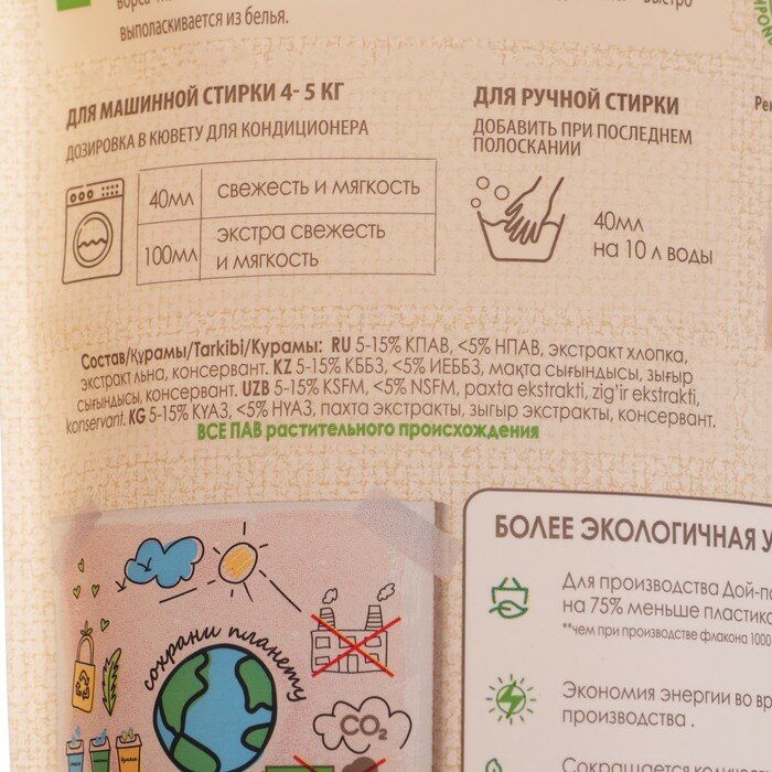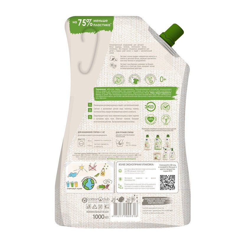 Гипоаллергенный кондиционер для детского белья (одежды, пеленок, постельного белья, полотенец) без отдушки с экстрактами хлопка и льна специально разработан для детей с первых дней жизни и людей с чувствительной кожей. - Экстракт хлопка придает невероятную мягкость и нежность детскому белью, защищая чувствительную кожу малыша от раздражения. - Экстракт льна бережно ухаживает за бельем, заботится о структуре ткани, оказывает легкое антибактериальное действие. Кондиционер разглаживает и смягчает детские вещи. Предотвращает износ ткани, появление катышков, а также поднятие и спутывание ворса ткани. Облегчает глажение. Оказывает антистатическое действие. Концентрированная формула обеспечивает экономичный расход. Ключевые характеристики: - Экстракты хлопка и льна; - Без: красителей, нефтепродуктов, агрессивных ПАВ, парабенов, SLS, эдта; - Atopic - для детской, чувствительной кожи; - Гипоаллергенно - сертификат на гипоаллергенность от незаивисмой лаборатории; - Экологический сертификат соответствия; - Биоразлагаемый состав - более 99% компонентов натурального происхождения; - Не содержит компоненты животного происхождения; - Упаковка подлежит вторичной переработке.