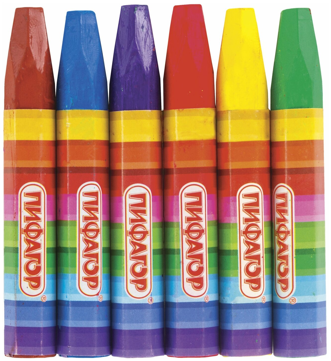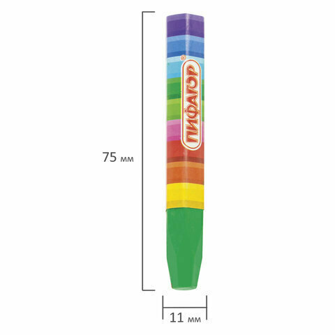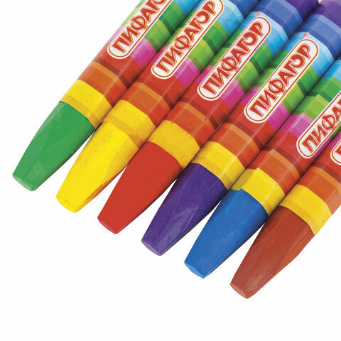 Палитра состоит из 6 ярких и насыщенных цветов. Полностью безопасны в использовании, не токсичны и не имеют резкого запаха. Благодаря своему составу карандаши пишут мягко, и ребенку не придется прикладывать усилия в процессе рисования. Утолщенная шестигранная форма корпуса и диаметр 11 мм делают их еще более удобными для тренировки руки к письму у дошкольников и детей младшего школьного возраста. Каждый карандаш завернут в бумажную этикетку, что предохраняет от загрязнений, снижает скольжение, увеличивает прочность. Восковые карандаши упакованы в картонную коробку с европодвесом.