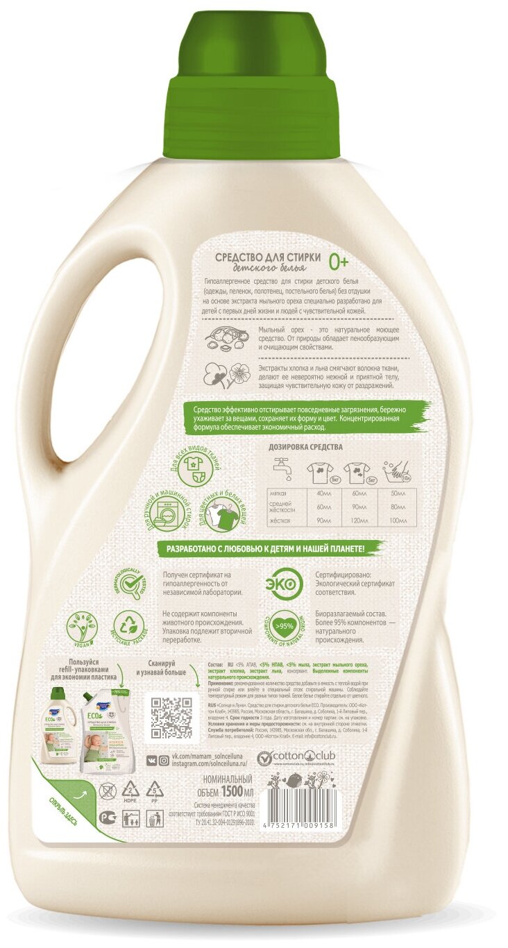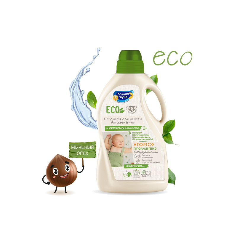 Гипоаллергенное средство для стирки детского белья (одежды, пеленок, полотенец, постельного белья) без отдушки на основе экстракта мыльного ореха специально разработано для детей с первых дней жизни и людей с чувствительной кожей.