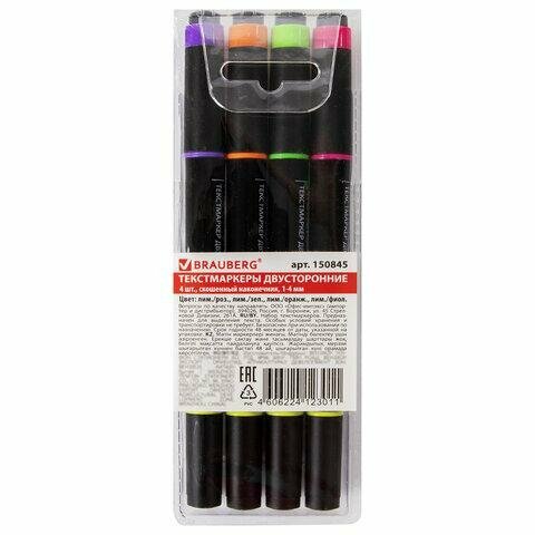 В наборе 4 двусторонних текстовыделителя неоновых цветов: желтый/зеленый, желтый/фиолетовый, желтый/розовый, желтый/оранжевый. Корпус тектовыделителя оснащен удобной зоной захвата. Скошенный наконечник имеет толщину линии письма от 1 до 4 мм, что обеспечивает удобство при работе с текстом, напечатанным мелким шрифтом, или таблицами. Текстовыделитель обладает экономным расходом чернил. Светоустойчивые чернила на водной основе не выцветают даже на открытом солнце и не размазываются в процессе использования. Изделие не перезаправляется. Цвет клипа соответствует цвету чернил.