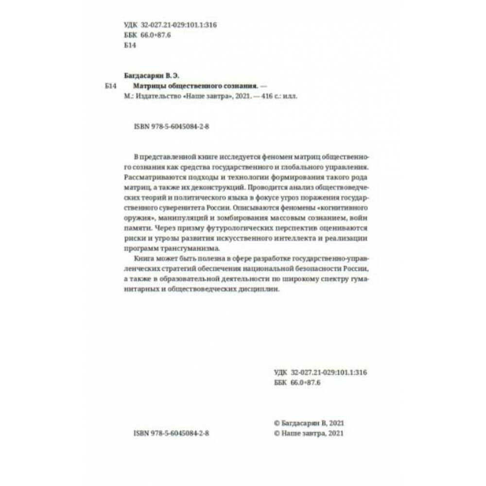 В представленной книге исследуется феномен матриц общественного сознания как средства государственного и глобального управления. Рассматриваются подходы и технологии формирования такого рода матриц, а также их деконструкций. Проводится анализ обществоведческих теорий и политического языка в фокусе угроз поражения государственного суверенитета России. Описываются феномены "когнитивного оружия", манипуляций и зомбирования массовым сознанием, войн памяти. Через призму футурологических перспектив оцениваются риски и угрозы развития искусственного интеллекта и реализации программ трансгуманизма.Книга может быть полезна в сфере разработке государственно-управленческих стратегий обеспечения национальной безопасности России, а также в образовательной деятельности по широкому спектру гуманитарных и обществоведческих дисциплин.