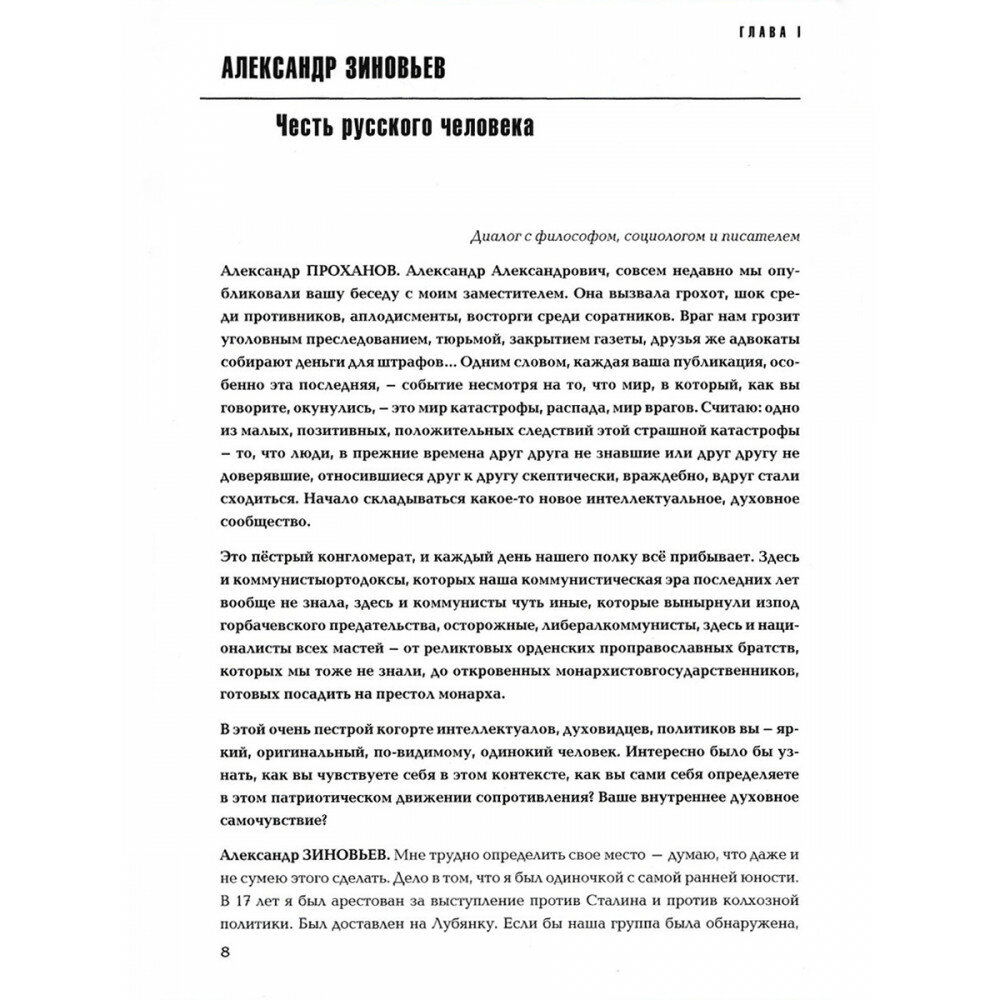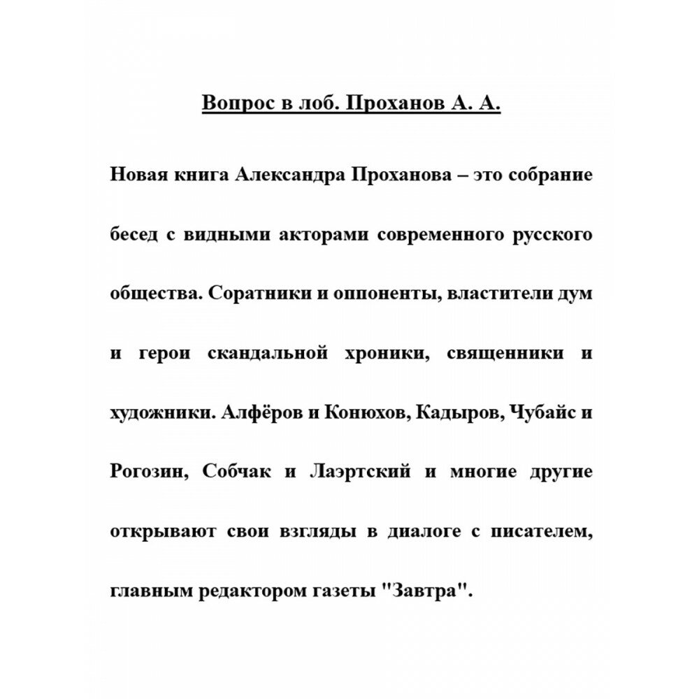 Новая книга Александра Проханова - это собрание бесед с видными акторами современного русского общества. Соратники и оппоненты, властители дум и герои скандальной хроники, священники и художники. Алфёров и Конюхов, Навальный и Кадыров, Чубайс и Рогозин, Собчак и Лаэртский и многие другие открывают свои взгляды в диалоге с писателем, главным редактором газеты "Завтра".