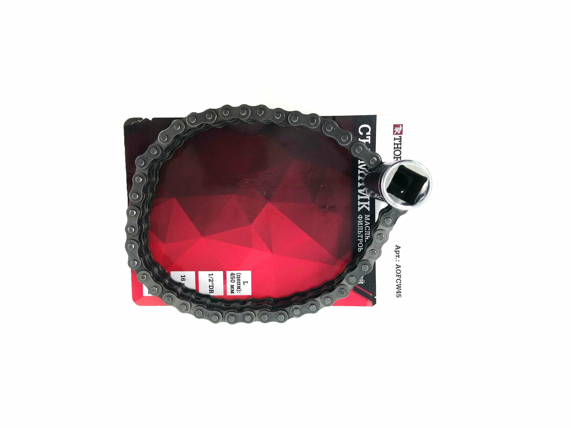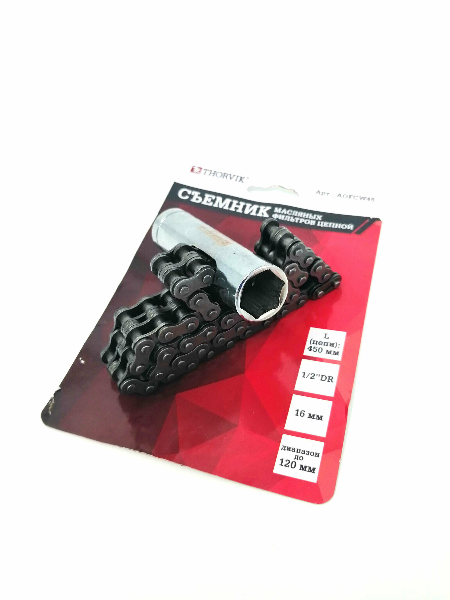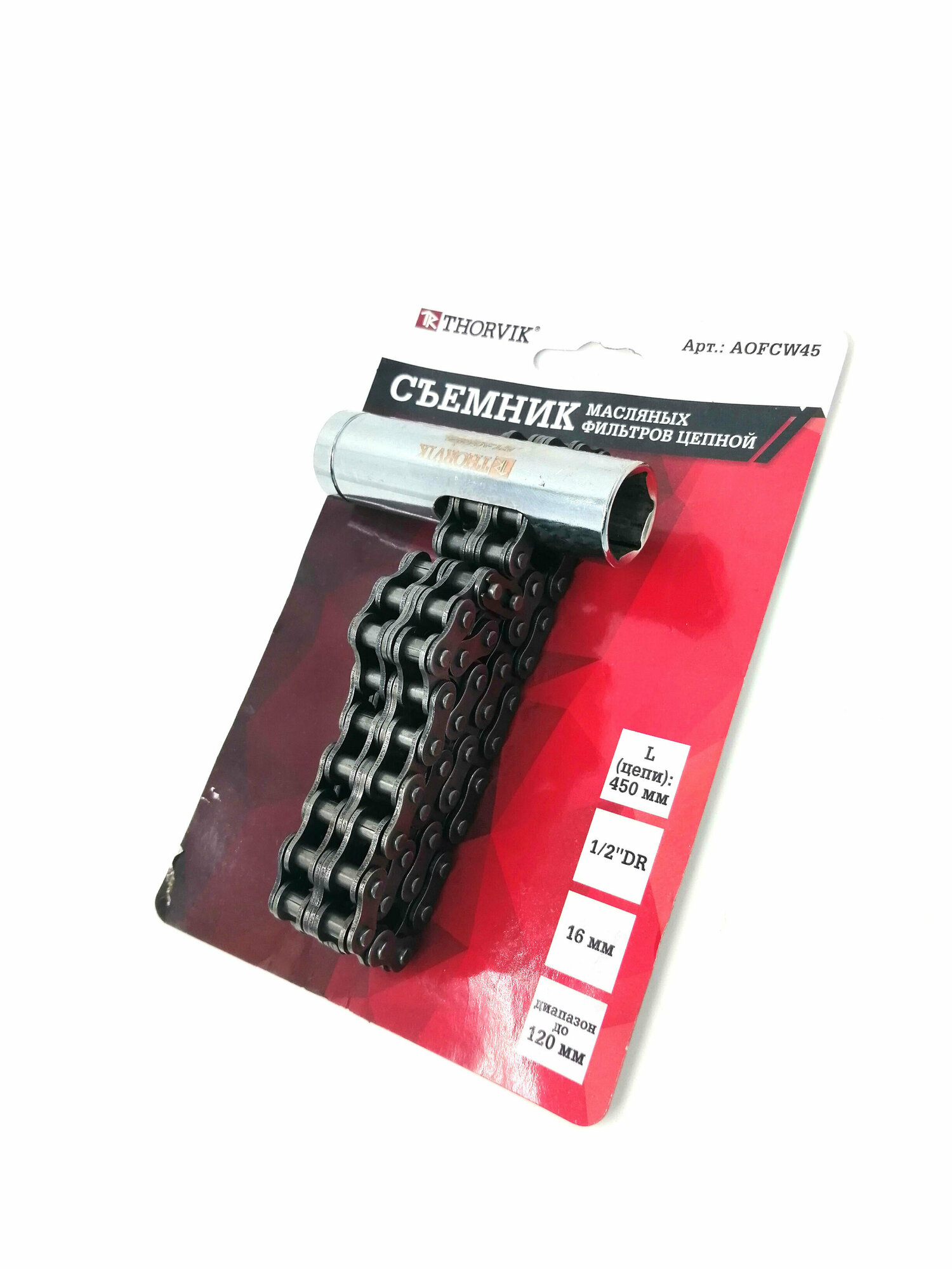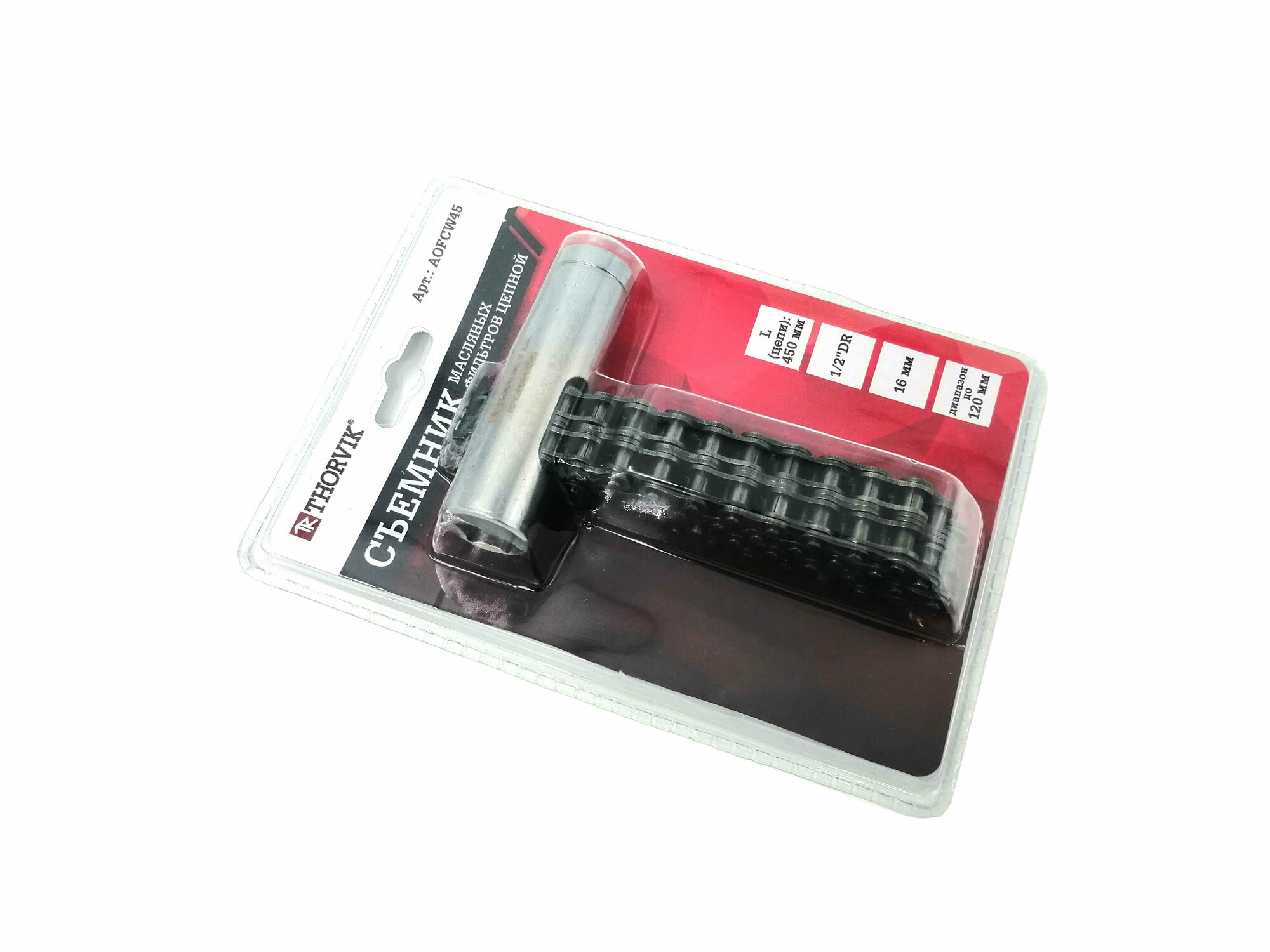 Съемник масляных фильтров цепной с приводом 1/2'DR, 16 мм HDR, с диапазоном до 120 мм THORVIK съемник корпусных масляных фильтров, В котором В качестве захвата используется цепь, наматываемая на привод С размером гнезда 1/2"DR И под ключ 16 мм HDR. Длина цепи составляет 450 мм, ЧТО позволяет использовать инструмент для обслуживания фильтров диаметром до 120 мм.