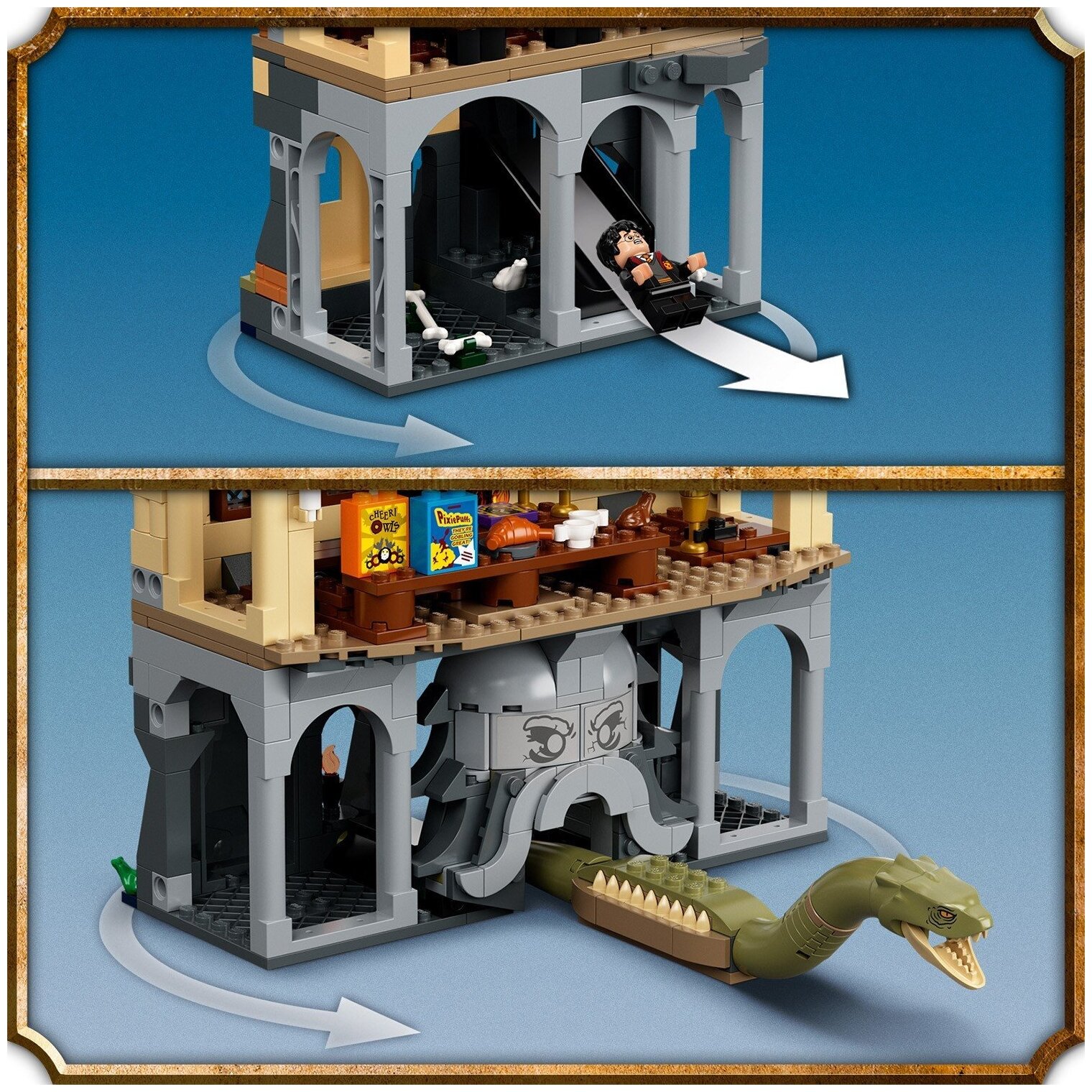| Комплектация | модульный игровой набор, 11 минифигурок:Гарри Поттер, Джинни Уизли, Том Реддл, Колин Криви, Джастин Финч-Флетчли, Полумна Лавгуд, Златопуст Локонс, Альбус Дамблдор, профессор Синистра, Почти Безголовый Ник, золотая минифигурка Волан-де-Морта, 6 случайных коллекционных плиток-карточек волшебников, подвижная фигурка василиска, инструкция, упаковка |