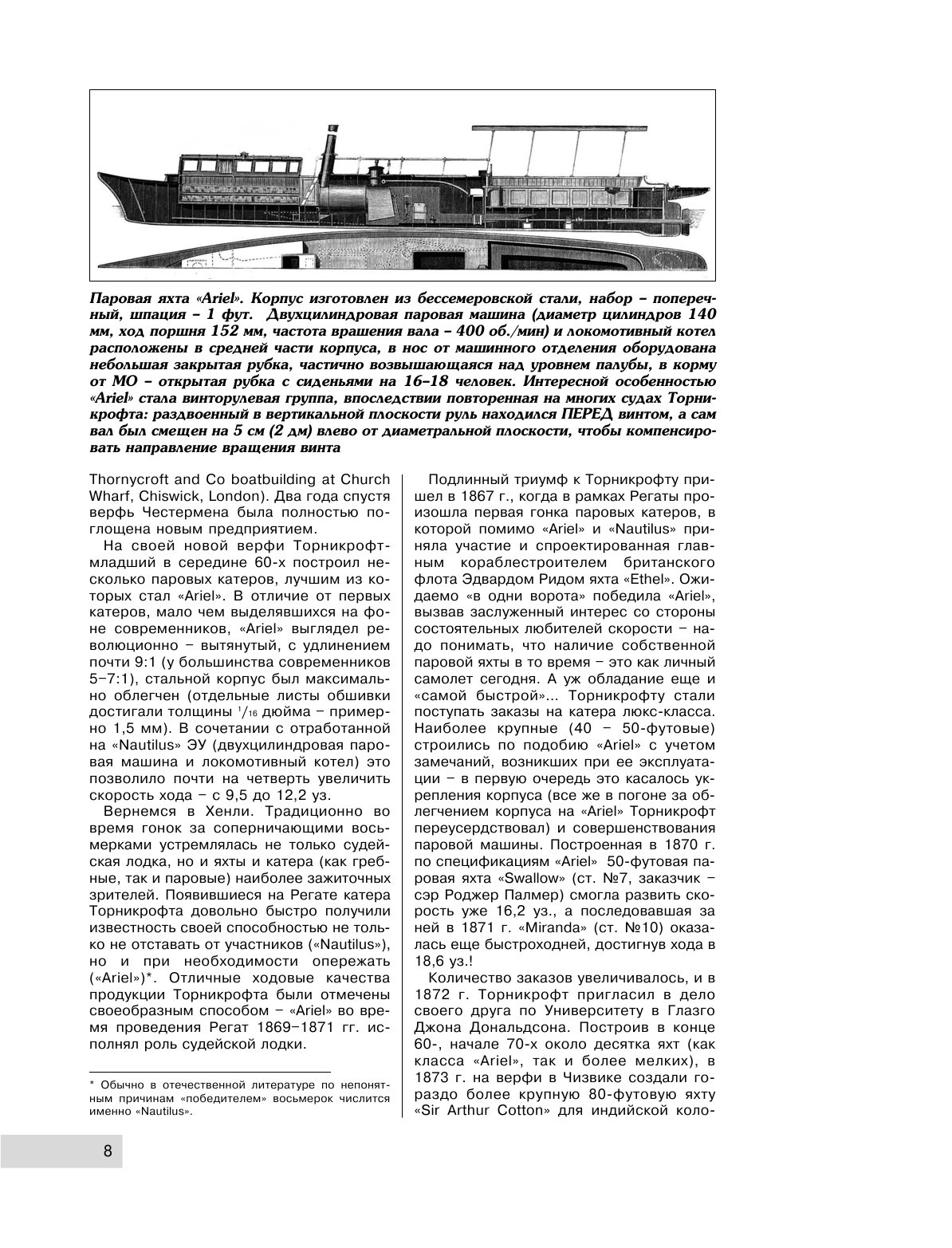 НОВАЯ КНИГА ведущего историка флота во всех деталях восстанавливает линию развития миноносцев постройки Торникрофта за тридцать лет - с 1873 по 1902 г., рассказывая в том числе о паровых яхтах и катерах, ставших боевыми кораблями (например, к ним принадлежала яхта «Штука», использовавшаяся русским флотом в качестве минного катера и участвовавшая в Русско-турецкой войне 1877-1878 гг.).