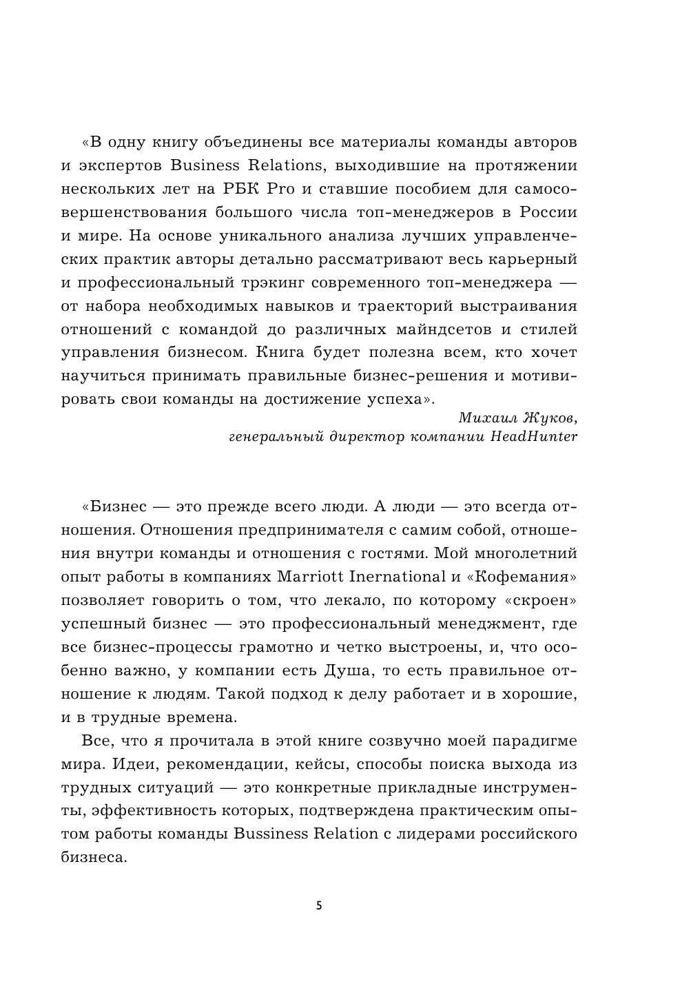 В одну книгу объединены все материалы команды авторов и экспертов Business Relations, выходившие на протяжении нескольких лет на РБК Pro и ставшие пособием для самосовершенствования большого числа топ-менеджеров в России и мире. На основе уникального анализа лучших управленческих практик авторы детально рассматривают весь карьерный и профессиональный трэкинг современного топ-менеджера – от набора необходимых навыков и траекторий выстраивания отношений с командой до различных майндсетов и стилей управления бизнесом. Эта книга будет полезна всем, кто хочет научиться принимать правильные бизнес-решения и мотивировать свои команды на достижение успеха