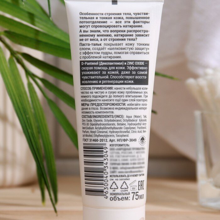 Паста-тальк покрывает кожу тонким слоем, создает «шелковистую защиту» с эффектом пудры, помогая справиться с проблемой натирания. D-Pantenol (Декспантенол) и Zinc Oxide эффективно ухаживают за кожей, даже за самой чувствительной, способствуют восстановлению и регенерации.