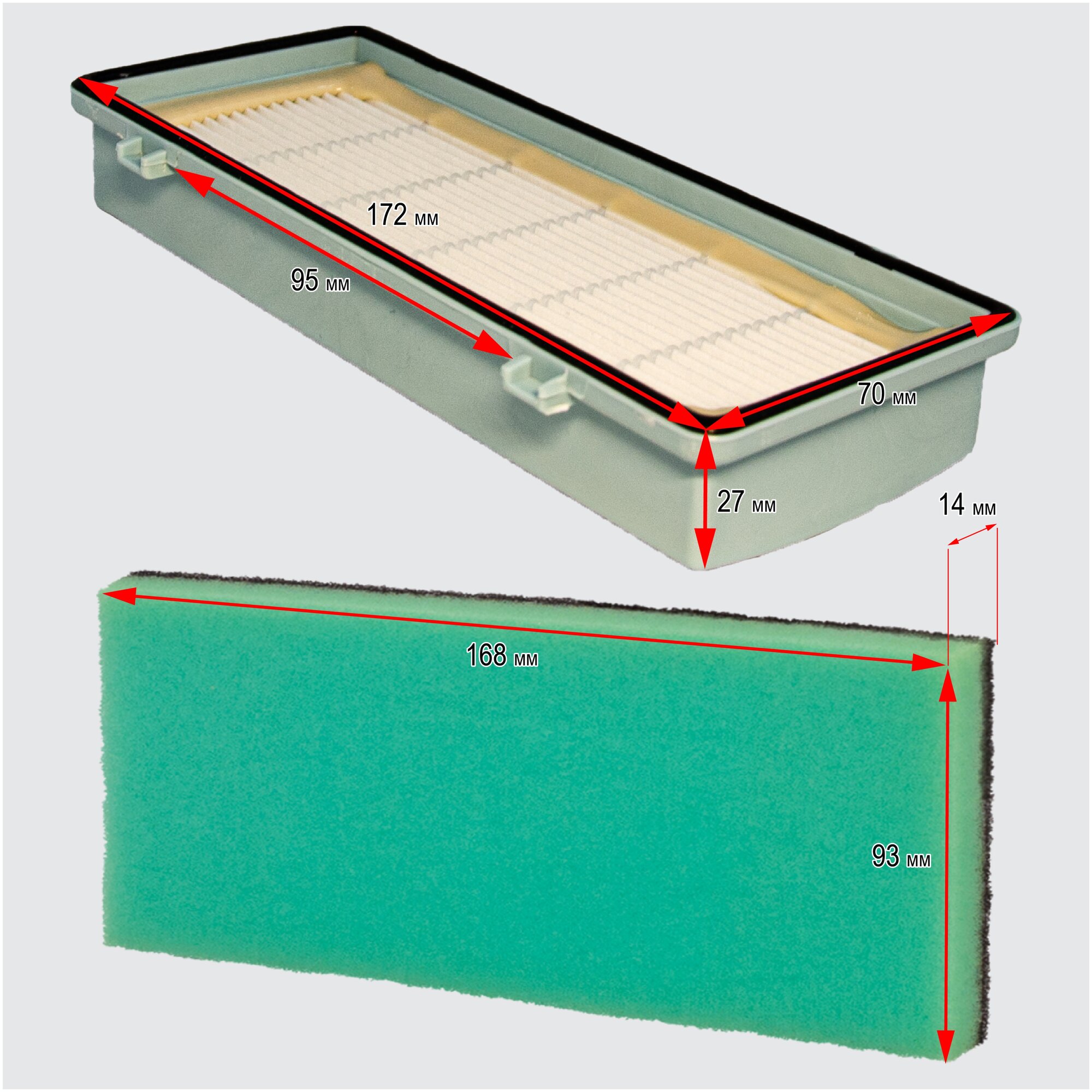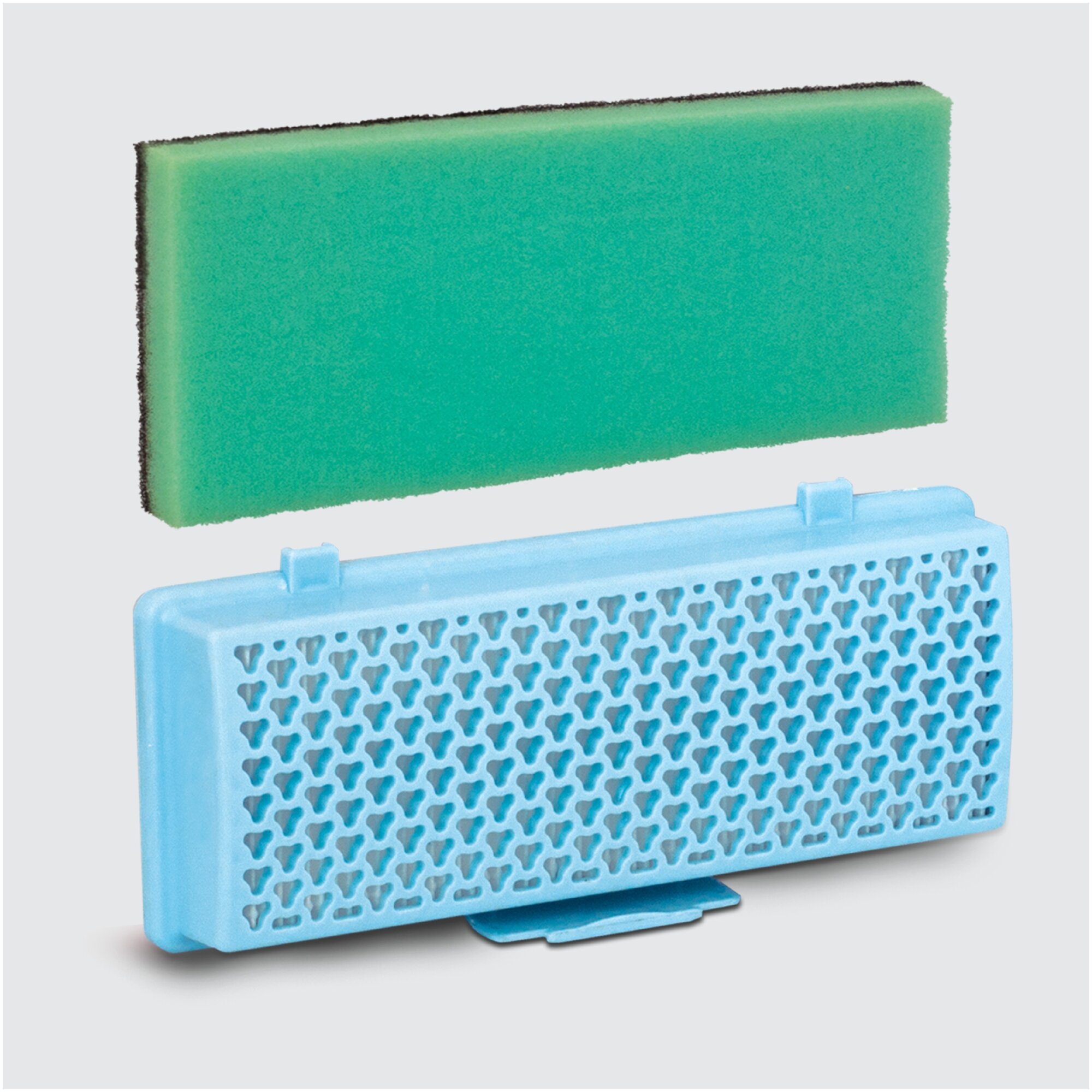 | Прочие особенности и свойства | В наборе 2 предмета: Губчатый фильтр - моющийся фильтр длительного использования защищает двигатель пылесоса от попадания тяжелых частиц пыли. HEPA фильтр - обладает высочайшей степенью фильтрации, задерживает 99,5% пыли. Благодаря специальным свойствам фильтрующего материала, фильтр улавливает мельчайшие частицы, позволяя очищать воздух от пыльцы, микроорганизмов, бактерий и пылевых клещей. |