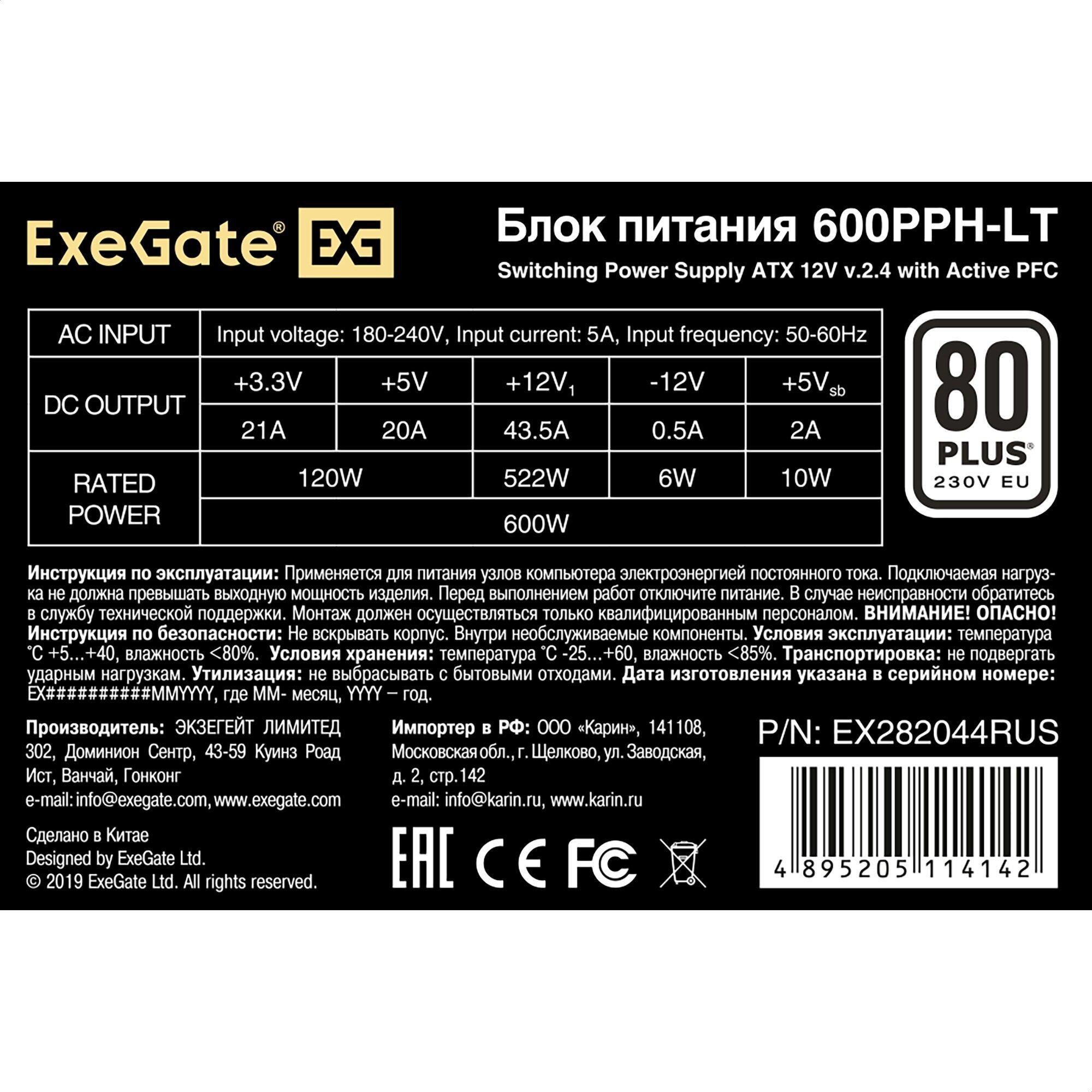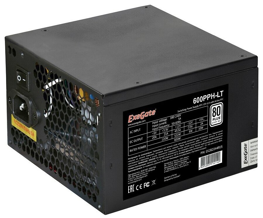 Блок питания 600W ExeGate 80 PLUS® (ATX, APFC, КПД 82% (80 PLUS)SC, 12cm fan, 24pin, (4+4)pin, PCIe, 5xSATA, 3xIDE, кабель 220V с защитой от выдергивания, black, RTL)