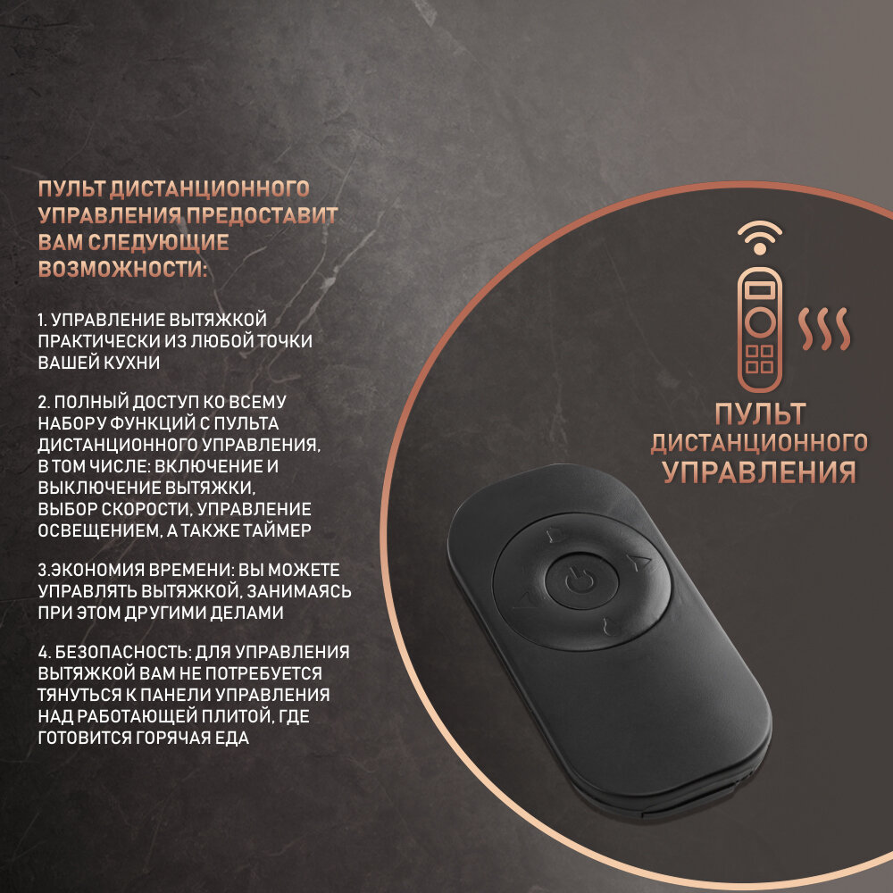 | Комплект поставки | вытяжка; пульт ду; угольный фильтр; жиропоглощающий фильтр; руководство по эксплуатации |