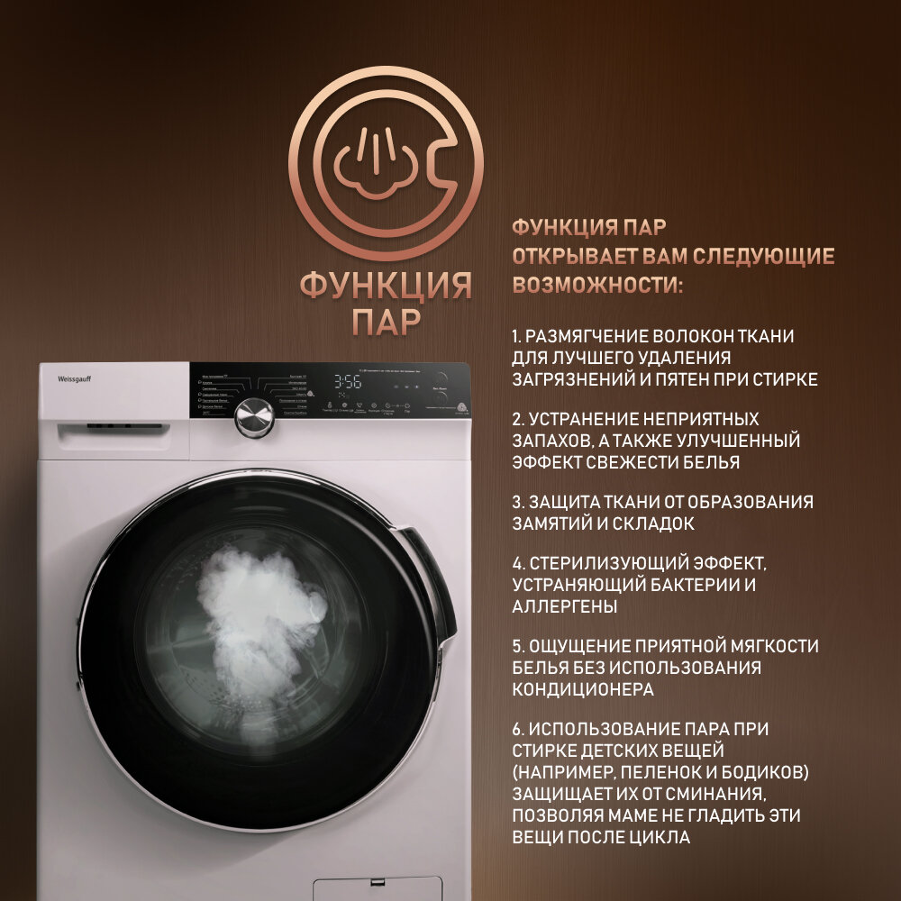 Стиральная машина Weissgauff WM 4947 DC Inverter Steam Silver серебристый корпус, серебристо-черный люк, фронтальная загрузка до 7кг, максимальная скорость отжима 1400об/мин, класс энергопотребления A+++ ()