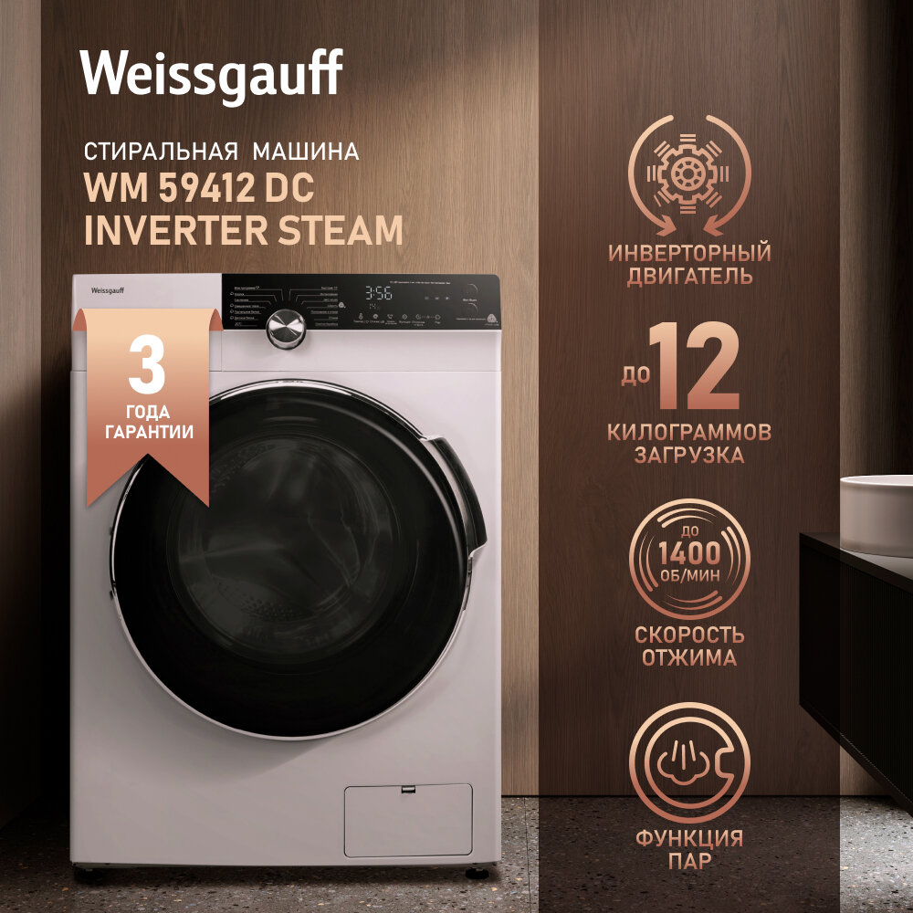 Стиральная машина Weissgauff WM 59412 DC Inverter Steam белый корпус, белый люк, фронтальная загрузка до 12кг, максимальная скорость отжима 1400об/мин, класс энергопотребления A+++ ()