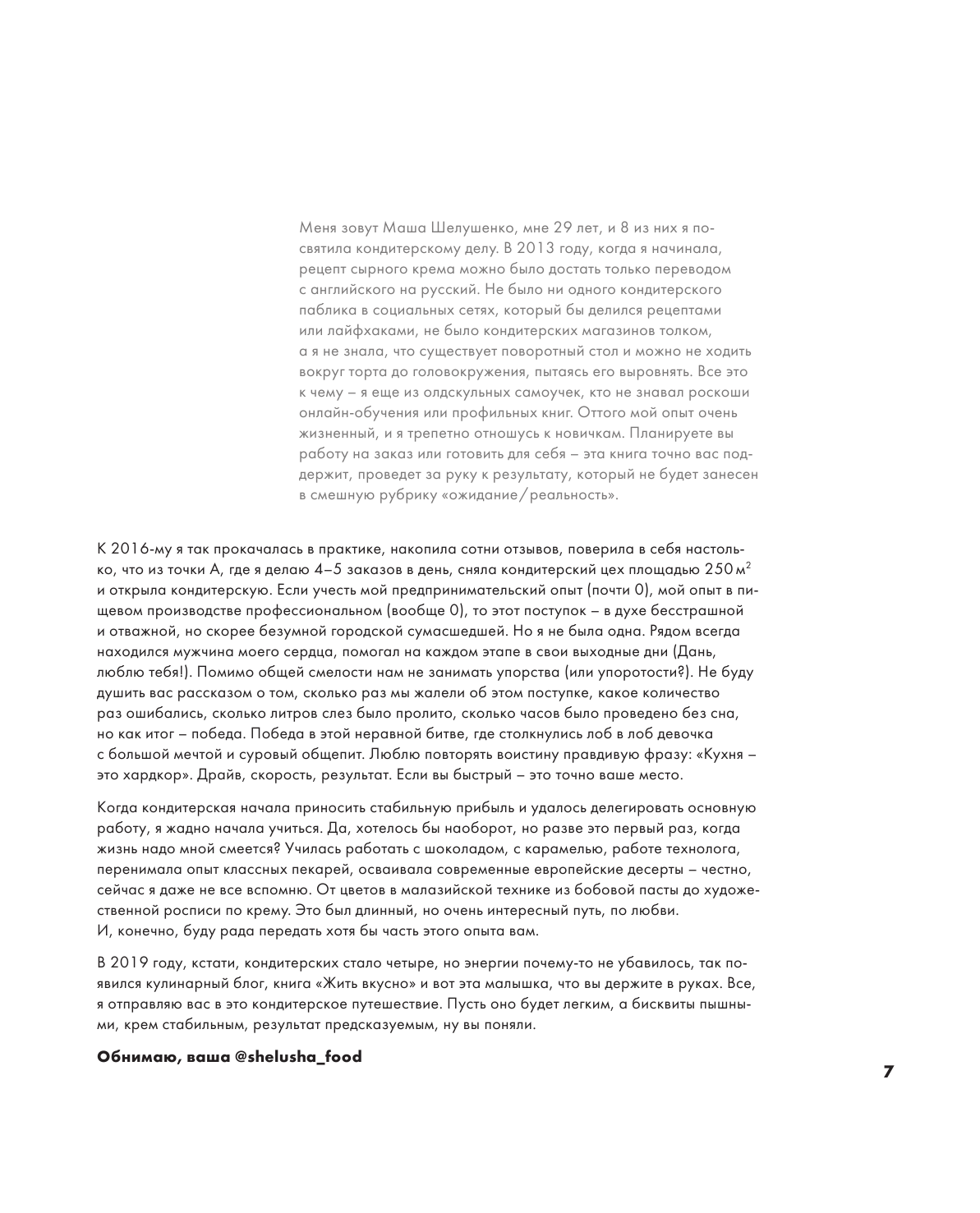 А попутно Маша расскажет о необходимом для кондитера инвентаре, подробно познакомит с особенностями ингредиентов и научит точно рассчитывать их количество для любых форм. А еще вы овладеете основами работы технолога и фуд-фотографа. Теперь торт мечты станет реальностью на каждой кухне, а Машина книга может оказаться незаменимой и для праздников в семье сладкоежек, и для успешного кондитерского стартапа.