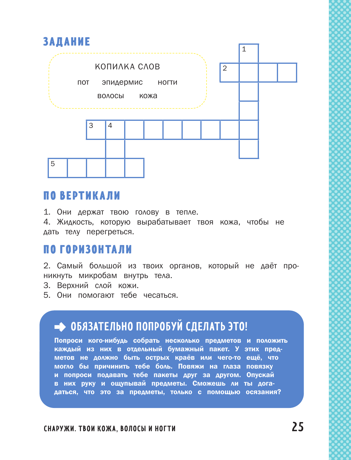 Я, как мама двоих детей, просто в восторге от этой книги. Она не просто интересно написана, она очень полезная и познавательная. Вряд ли я бы в такой простой форме смогла объяснить столько всего непонятного о строении тела да ещё и закрепить весь материал. Автор же это делает в игровой форме, с помощью кроссвордов и других заданий! Рекомендую всем родителям!