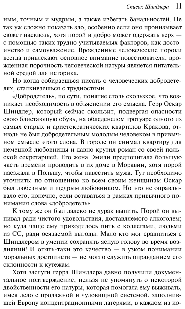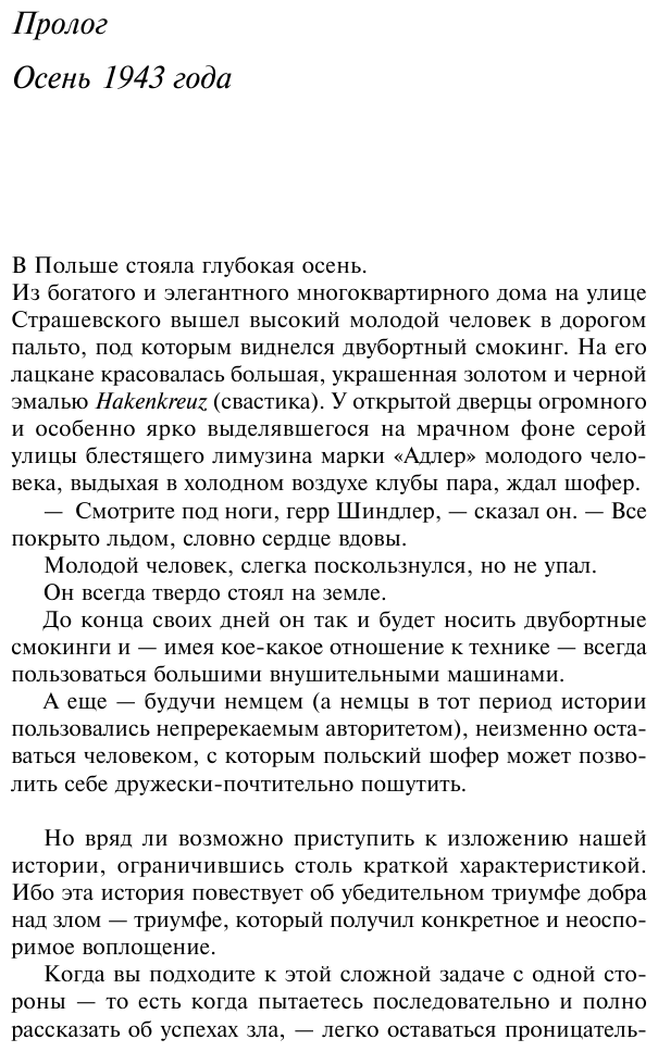 Для меня это великое произведение, затрагивающие судьбу целого народа, который пытались годами сжечь с лица земли. Учитывая, что не очень люблю исторические книги, эта книга меня удивила, читается потрясающе, слог автора прекрасный. Оскар Шиндлер конечно вызывает бурю положительных эмоций, а некоторые сцены просто проживаешь со слезами на глазах, а где-то даже смеешься или улыбаешься с действующими лицами страниц несмотря на весь этот ужас.