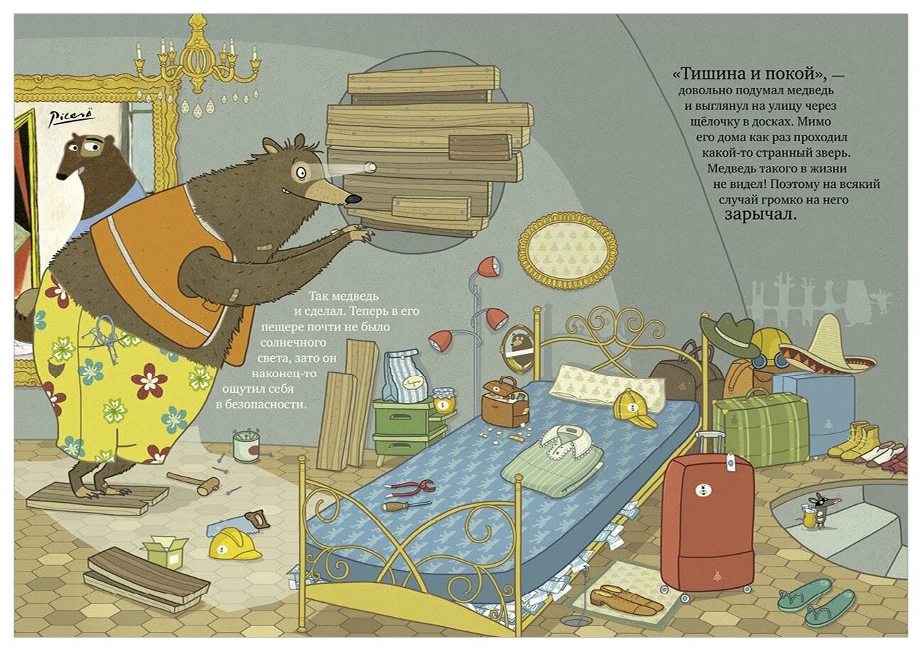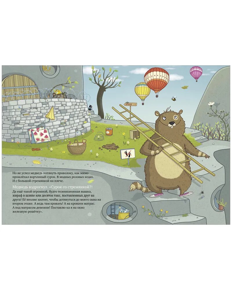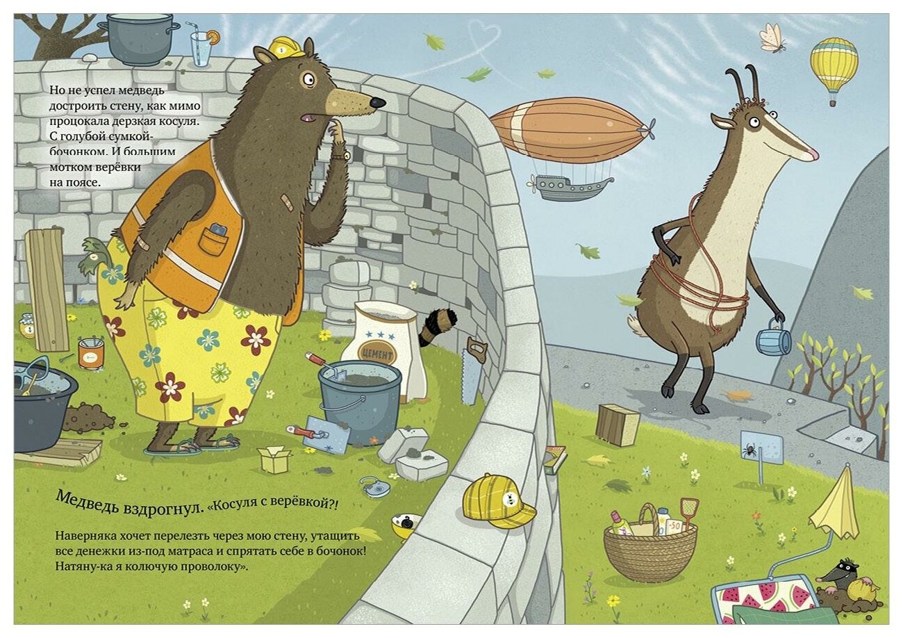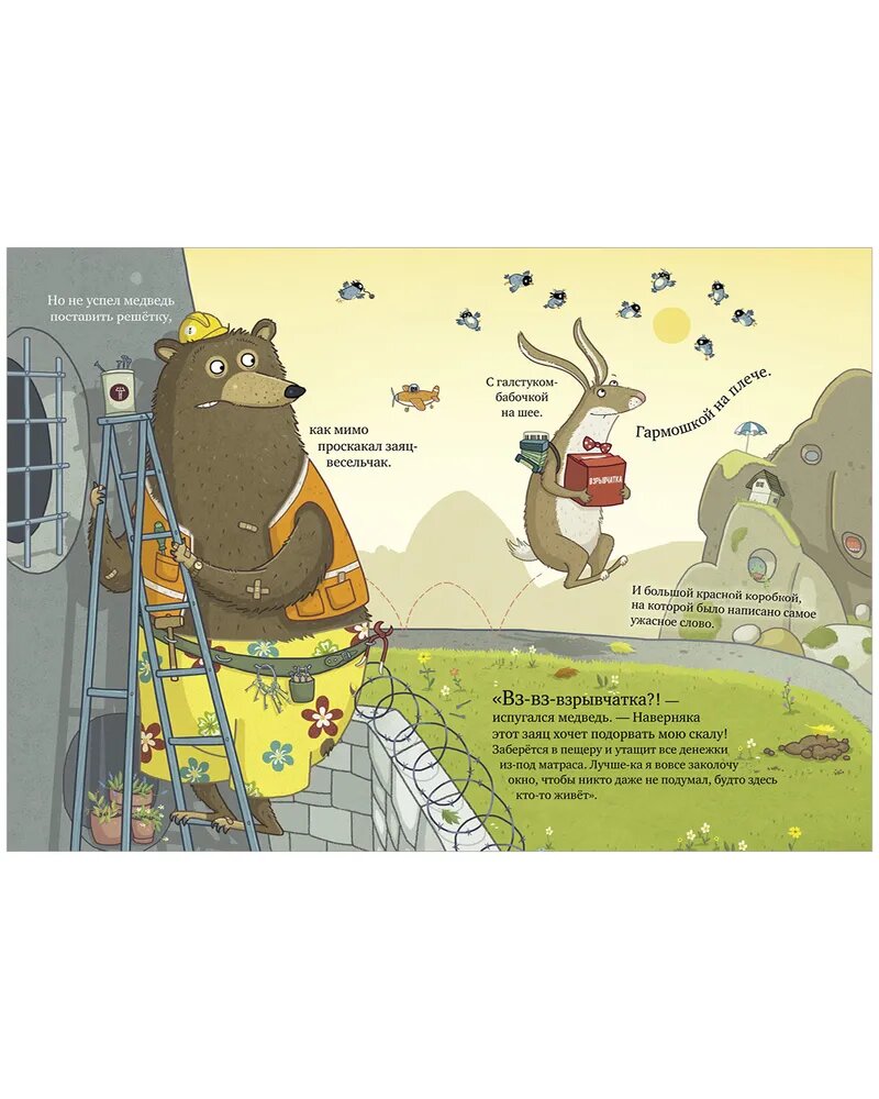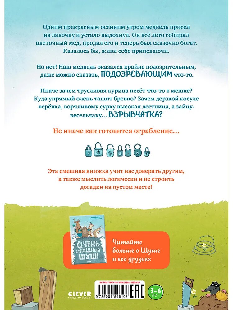Одним прекрасным осенним утром медведь присел на лавочку и устало выдохнул. Он всё лето собирал цветочный мёд, продал его и теперь был сказочно богат. Казалось бы, живи себе припеваючи. Но нет! Наш медведь оказался крайне подозрительным, даже можно сказать, ПОДОЗРЕВАЮЩИМ что-то. Иначе зачем трусливая курица несёт что-то в мешке? Куда упрямый олень тащит бревно? Зачем дерзкой косуле верёвка, ворчливому сурку высокая лестница, а зайцу-весельчаку… ВЗРЫВЧАТКА? Не иначе как готовится ограбление… Эта смешная книжка учит нас доверять другим, а также мыслить логически и не строить догадки на пустом месте!