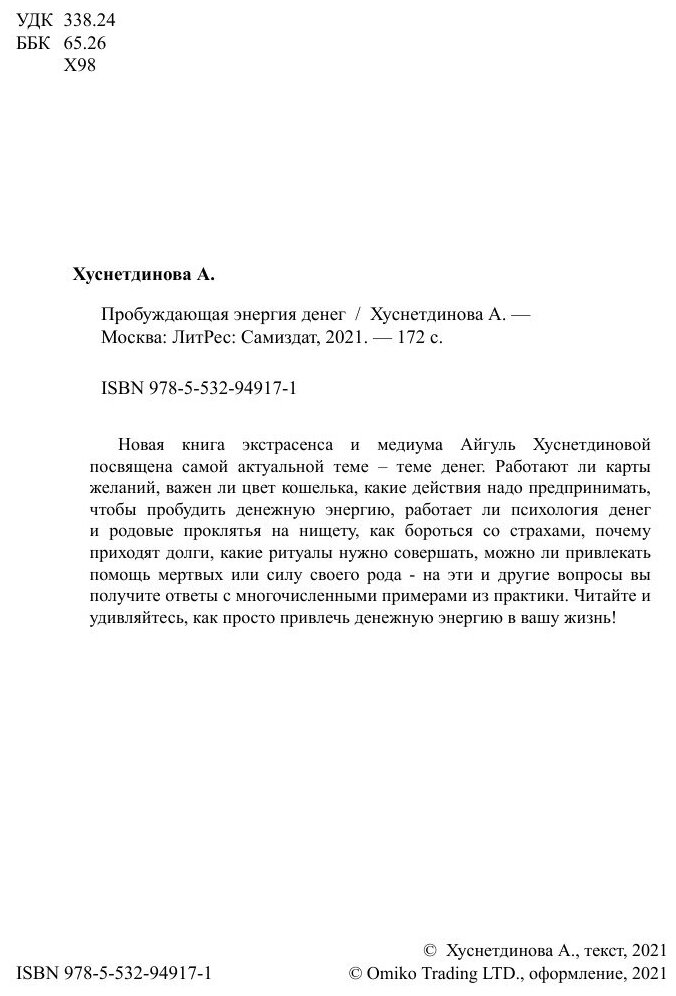 Новая книга экстрасенса и медиума Айгуль Хуснетдиновой посвящена самой актуальной теме – теме денег. Работают ли карты желаний, важен ли цвет кошелька, какие действия надо предпринимать, чтобы пробудить денежную энергию, работает ли психология денег и родовые проклятья на нищету, как бороться со страхами, почему приходят долги, какие ритуалы нужно совершать, можно ли привлекать помощь мертвых или силу своего рода – на эти и другие вопросы вы получите ответы с многочисленными примерами из практики. Читайте и удивляйтесь, как просто привлечь денежную энергию в вашу жизнь!