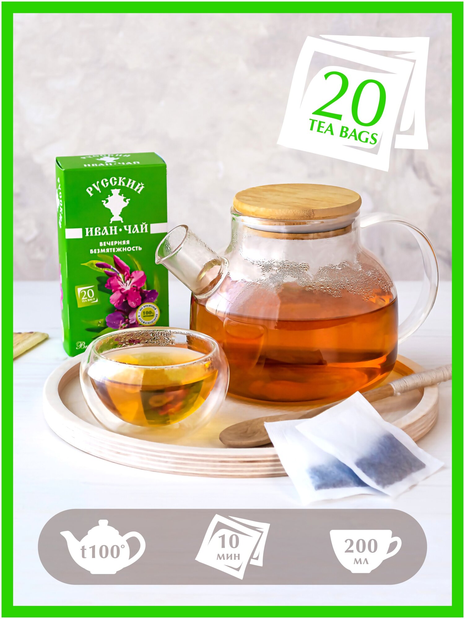 Условия храненияИван-чай "Вечерняя безмятежность" хранить в сухом месте вдали от сильных запахов при температуре от 5° до 25° C и относительной влажности воздуха не более 70%.СоставЛистья кипрея ферментированные 100%Комплектация20 фильтр-пакетиков с иван-чаем Позади день, наполненный важными делами, волнениями, суетой и тревогами. Вечером так хочется заботы и тепла! Чай «Вечерняя безмятежность», без сомнений, подарит вам ощущение уюта и спокойствия и, как бонус – крепкий и здоровый сон! Наш чай в пакетиках удобен как для заваривания в чашке, так и для заваривания в чайнике во время семейных чаепитий. Положите 2 пакетика в чайник, налейте в чайник кипяток – вкусный и полезный чай для всей семьи готов! Идеально сочетается с натуральной яблочной пастилой, созданной с любовью компанией «ТД «Русский чай»!С заботой о вас и вашем сне, команда ООО «ТД «Русский чай»