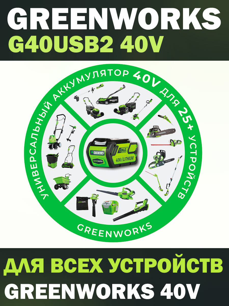 | Комплектация | Аккумулятор Greenworks G40USB2 G-MAX 40V, 2 Ач Руководство по эксплуатации Гарантийный талон. Внимание |