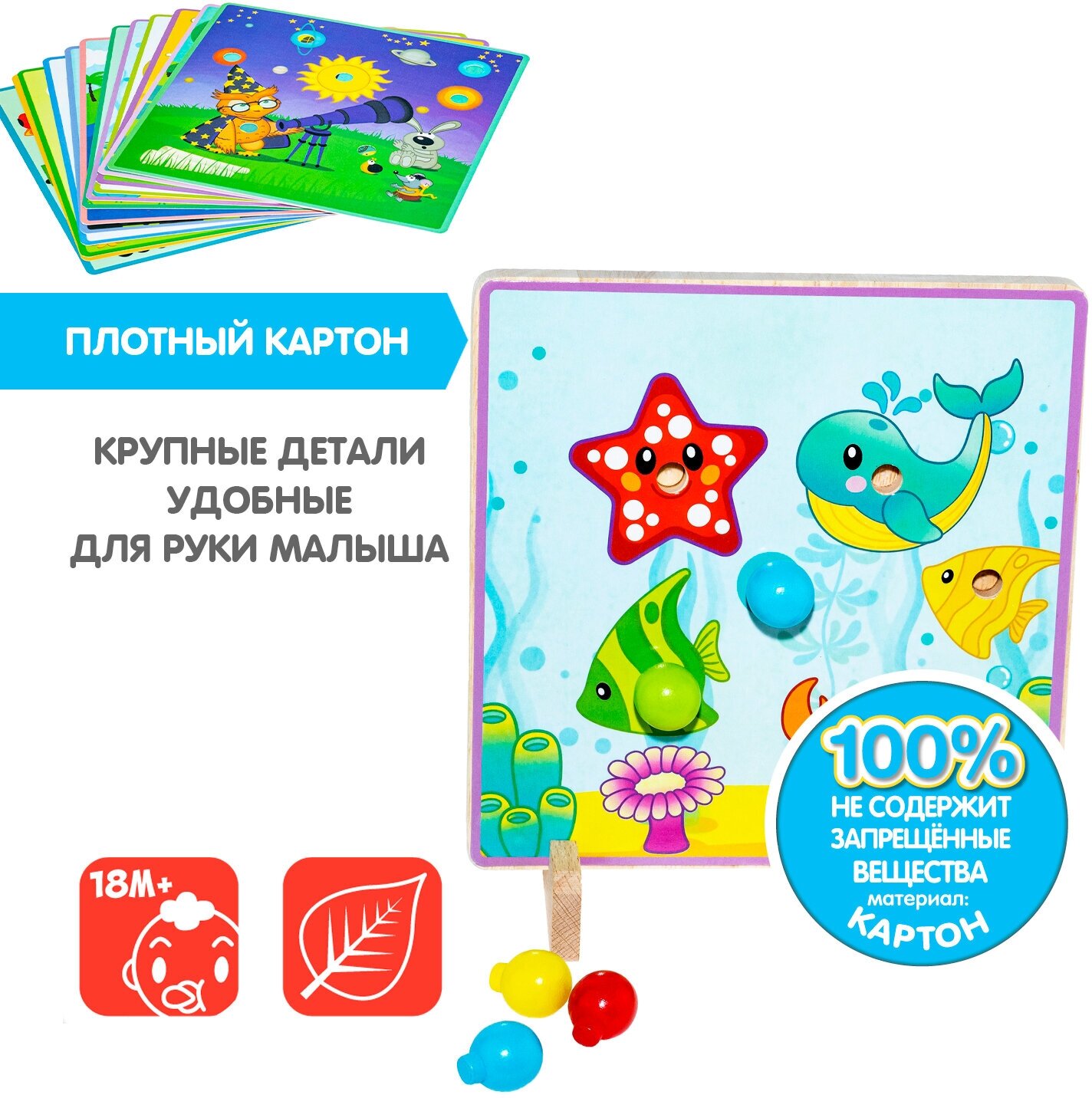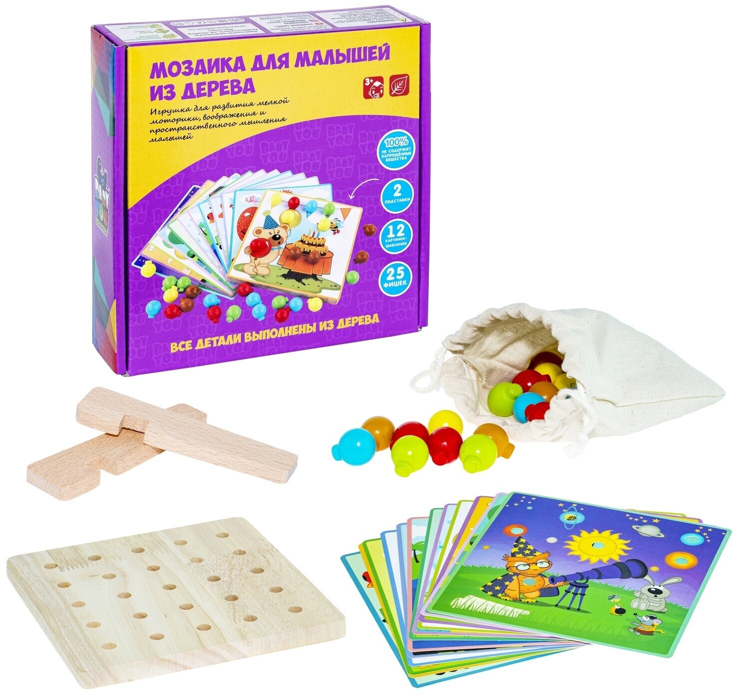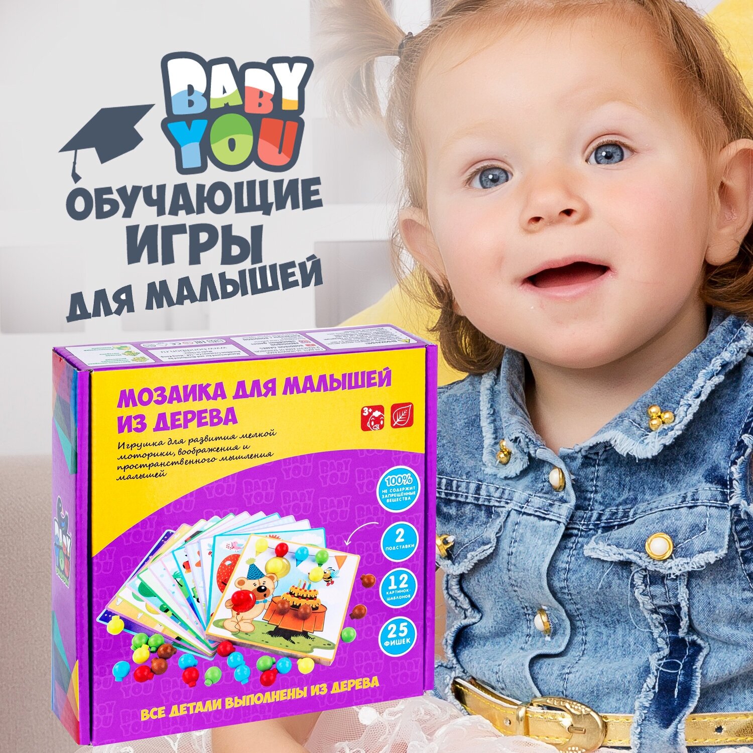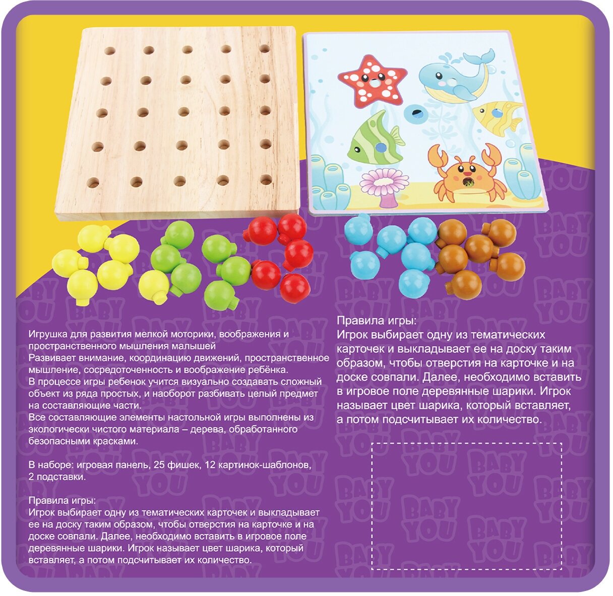 Яркая разноцветная Мозаика для малышей из дерева серии Baby You ТМ Bondibon - это игровой набор из деревянной панели с подставкой, ярких картинок-сюжетов и разноцветных фишек-шариков.