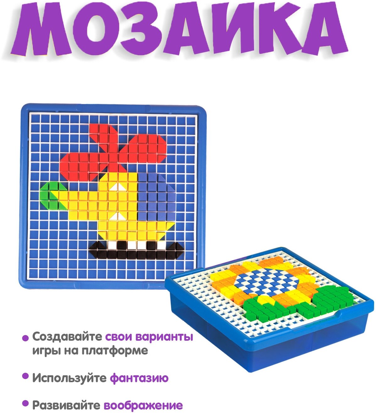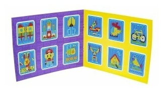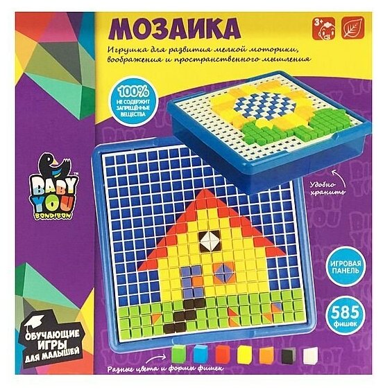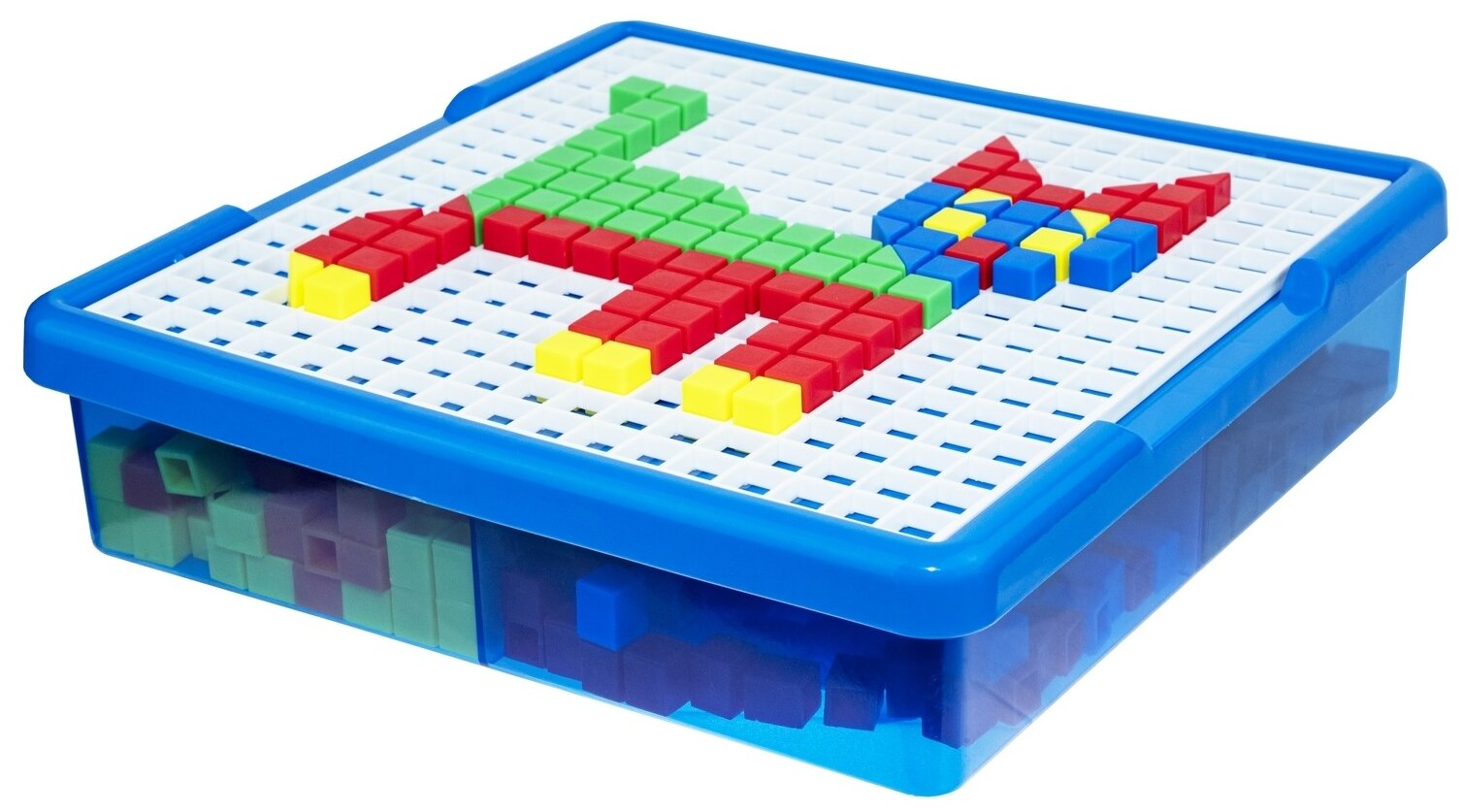 В комплекте: 585 деталей белого, черного, синего, зеленого, красного, желтого, оранжевого цветов и игровое поле с пластиковым контейнером для хранения элементов мозаики.