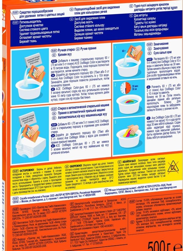 Пятновыводитель Ace OxiMagic Color - это порошкообразное средство для удаления пятен с цветных вещей. Активные компоненты справляются даже с трудновыводимыми пятнами, при этом цвет сохраняет свою яркость, а сама ткань не деформируется и не повреждается. Подходит для ручной и автоматической стирки (добавляется к стиральному порошку), а также для предварительного замачивания (при незначительных загрязнениях достаточно замочить белье на 30 минут, при особо сильных - на ночь). После использования пятновыводител