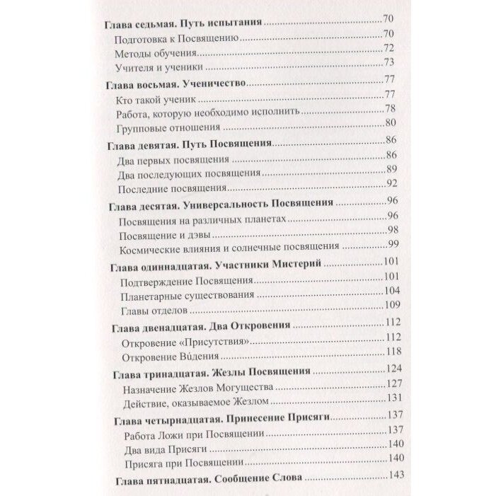 Также дан огромный объём информации, касающийся Посвящения - того процесса, благодаря которому человек может войти в духовную Иерархию; показаны основные законы развития ученика на пути Испытания, Ученичества и Посвящения.
