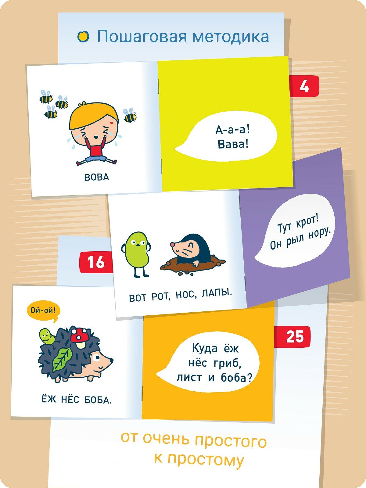 Все книжки пронумерованы и читать их надо по порядку. Каждая книжка знакомит ребенка с одной новой буквой. Начинаем с "А" - в первой книжке есть только эта буква. Дальше к "А" добавляется "О". Потом "Б" - здесь уже появляются настоящие слова "баба", "оба", "боб". Следом "В" - и так далее.