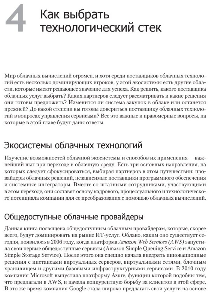 Прочитав эту книгу, вы освоите приемы, необходимые для перехода на облачно-ориентированные архитектуры с учетом требований вашего бизнеса. Вы также узнаете о перспективных тенденциях в сфере облачных сервисов и векторах развития облачных провайдеров.