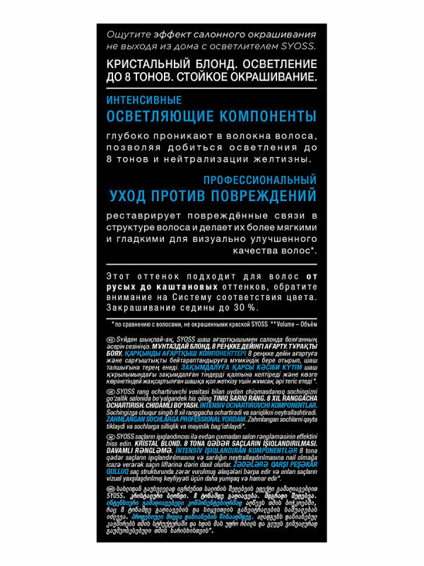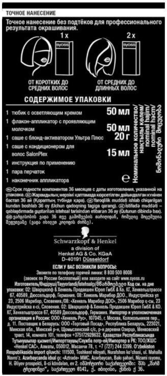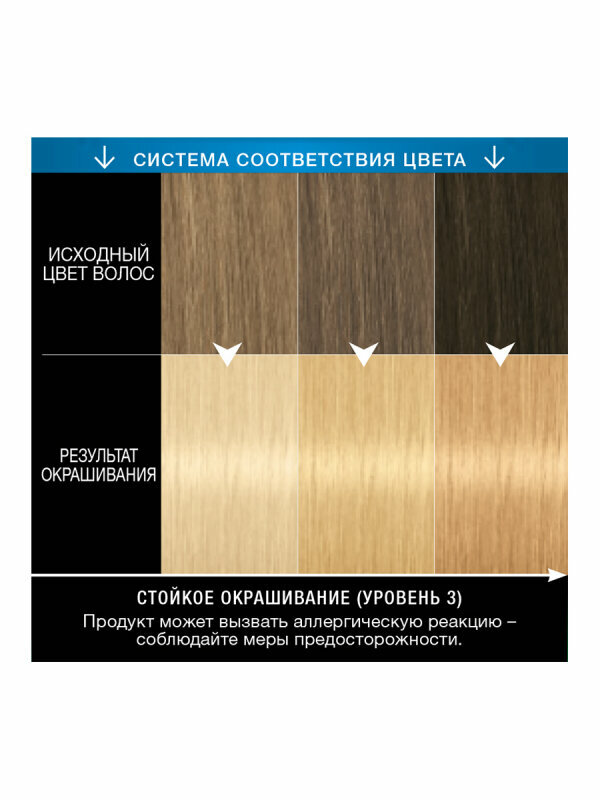 | Химический состав | Окрашивающий Крем: Aqua (Water, Eau), Cetearyl Alcohol, Ammonium Hydroxide, Coconut Alcohol, Sodium Laureth-6 Carboxylate, Sodium Myreth Sulfate, Succinic Acid, Bis- Diisopropanolamino-PG-Propyl Dimethicone/Bis-Isobutyl PEG-14 Copolymer, Ammonium Sulfate, Acrylamidopropyltrimonium Chloride/Acrylates Copolymer, Coco-Glucoside, Paraffinum Liquidum (Mineral Oil, Huile Minérale), Glyceryl Oleate, Arginine, Lysine HCl, Ceteareth-12, Ceteareth-20, Parfum (Fragrance), Sodium Sulfite, Potassium Hydroxide, Sodium Silicate, Toluene-2,5-Diamine Sulfate, Etidronic Acid, Ascorbic Acid, Resorcinol, Sodium Chloride, Butyloctanol, Citric Acid, Polysorbate 20, Linalool, Phenoxyethanol, Benzyl Salicylate, Hydroxyethyl-p-Phenylenediamine Sulfate, Lactic Acid, Citronellol, Geraniol, Limonene, Sodium Benzoate, m-Aminophenol, 2,4-Diaminophenoxyethanol HCl, Methylparaben, Ethylparaben, 4-Amino-2- Hydroxytoluene Проявляющая эмульсия: Aqua (Water, Eau), Hydrogen Peroxide, Cetearyl Alcohol, Propylene Glycol, Ceteareth-20, Steartrimonium Chloride, Paraffinum Liquidum (Mineral Oil, Huile Minérale), Etidronic Acid, 2,6-Dicarboxypyridine, Disodium Pyrophosphate, Potassium Hydroxide, Isopropyl Alcohol, Sodium Benzoate Ухаживающая маска для волос |