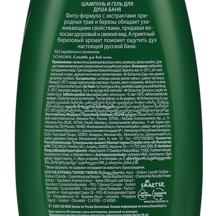 Русская баня всегда была, есть и будет неотъемлемой частью нашего менталитета. Она укрепляет тело, тонизирует, повышает иммунитет и избавляет от стресса. Невозможно представить баню без запаха трав и березового веника, ведь именно эти компоненты делают баню эффективным инструментом для полноценного оздоровления организма. Новая серия Schauma Баня с фито-формулой содержит экстракты трав шалфея, ромашки, хвоща и березы, известные своими полезными свойствами на протяжении многих веков. Шампунь и гель для душа Schauma Баня обладает фито-формулой с экстрактом березы и природными травами без парабенов и силиконов. Средство подходит для ухода за волосами и телом и способствует смягчению волос.