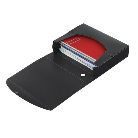Вмещает до 750 листов формата А4. Изготовлен из прочного пластика синего цвета толщиной 0.7 мм. В закрытом виде фиксируется с помощью металлической кнопки. Сменная этикетка в кармане на корешке. Поставляется в разобранном виде.