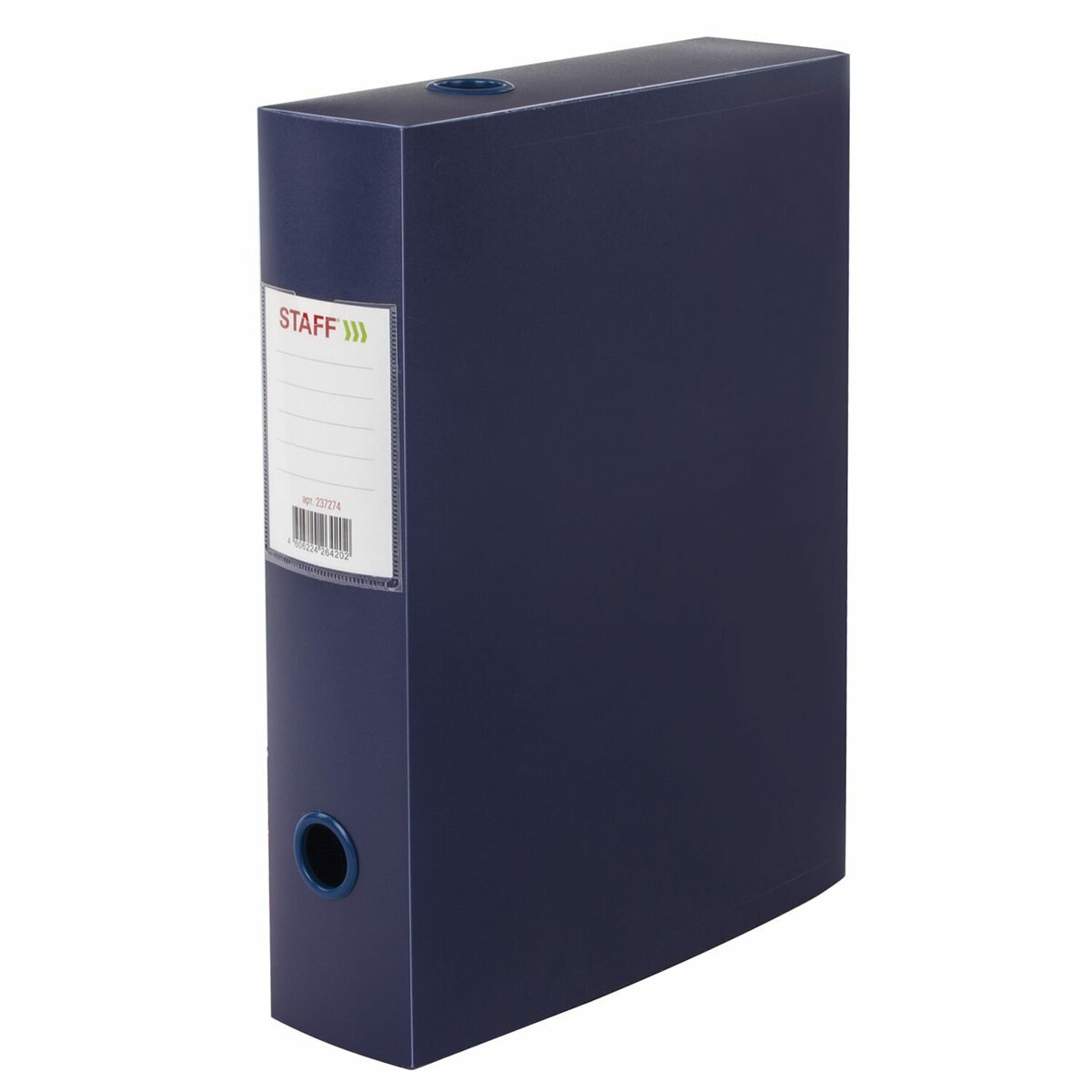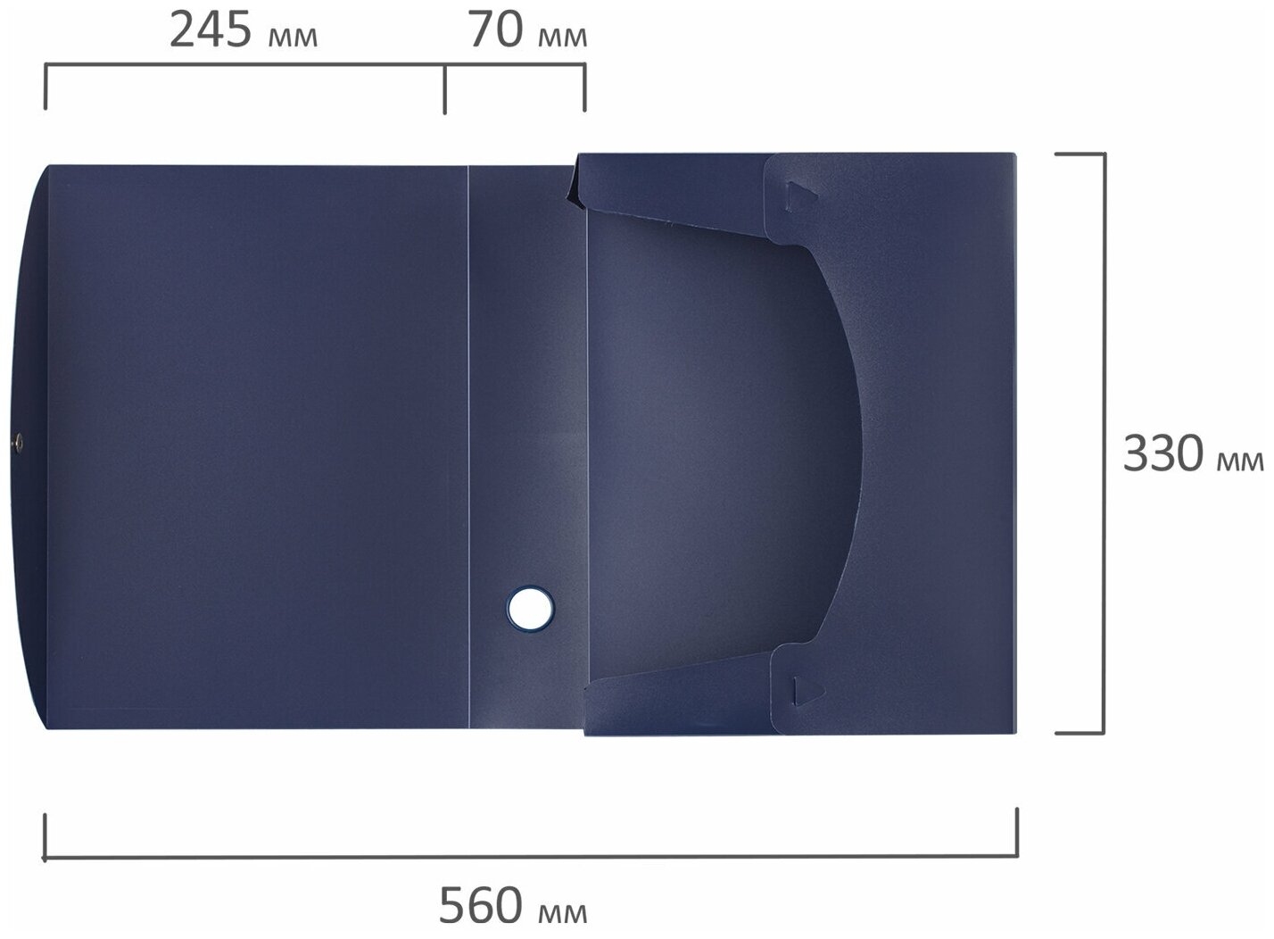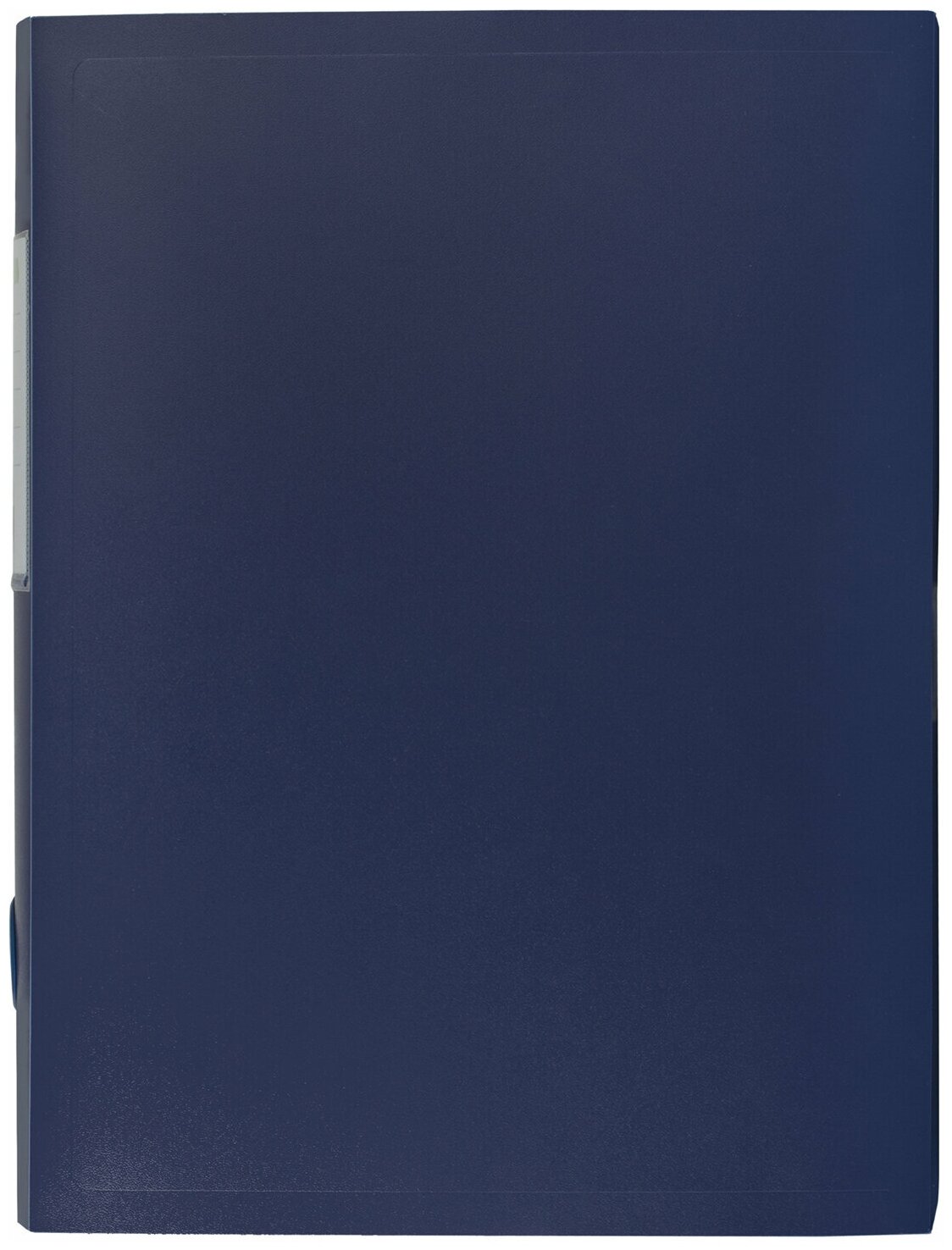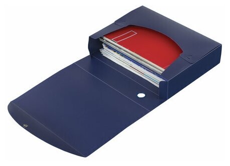 Вмещает до 750 листов формата А4. Изготовлен из прочного пластика синего цвета толщиной 0.7 мм. В закрытом виде фиксируется с помощью металлической кнопки. Сменная этикетка в кармане на корешке. Поставляется в разобранном виде.