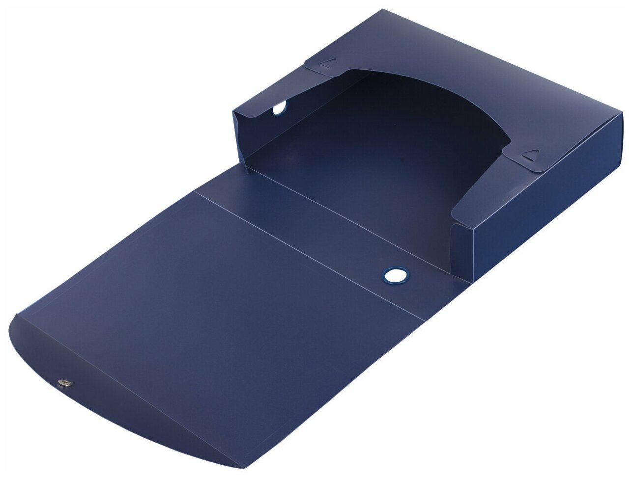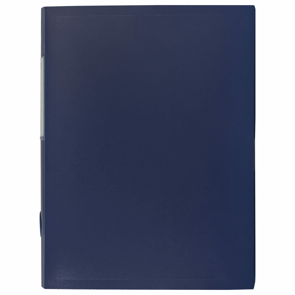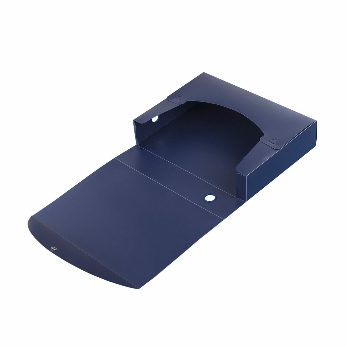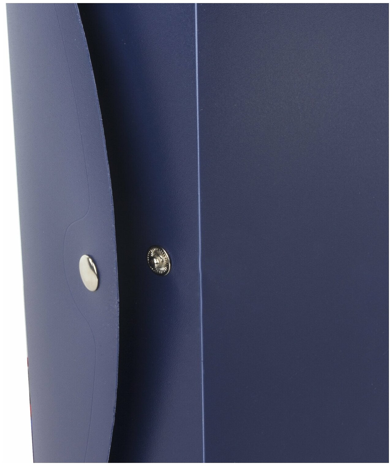 Вмещает до 750 листов формата А4. Изготовлен из прочного пластика синего цвета толщиной 0.7 мм. В закрытом виде фиксируется с помощью металлической кнопки. Сменная этикетка в кармане на корешке. Поставляется в разобранном виде.