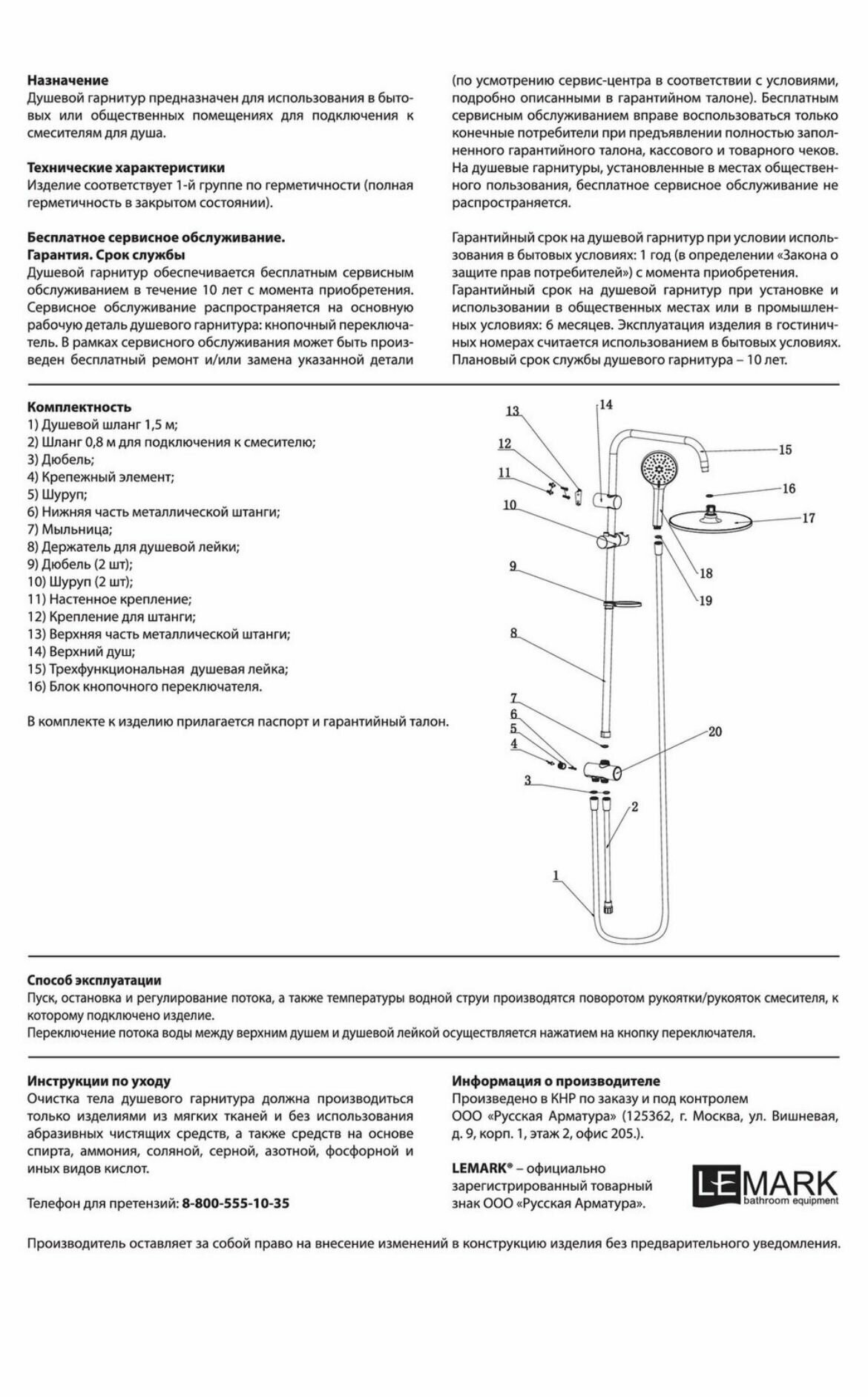 | Комплектация | верхний душ, штанга, ручной душ (лейка), держатель лейки, шланг, мыльница или держатель для мыла |
