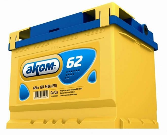 | Характеристики | напряжение 12 В, емкость 62 Ач, пусковой ток 560 A |