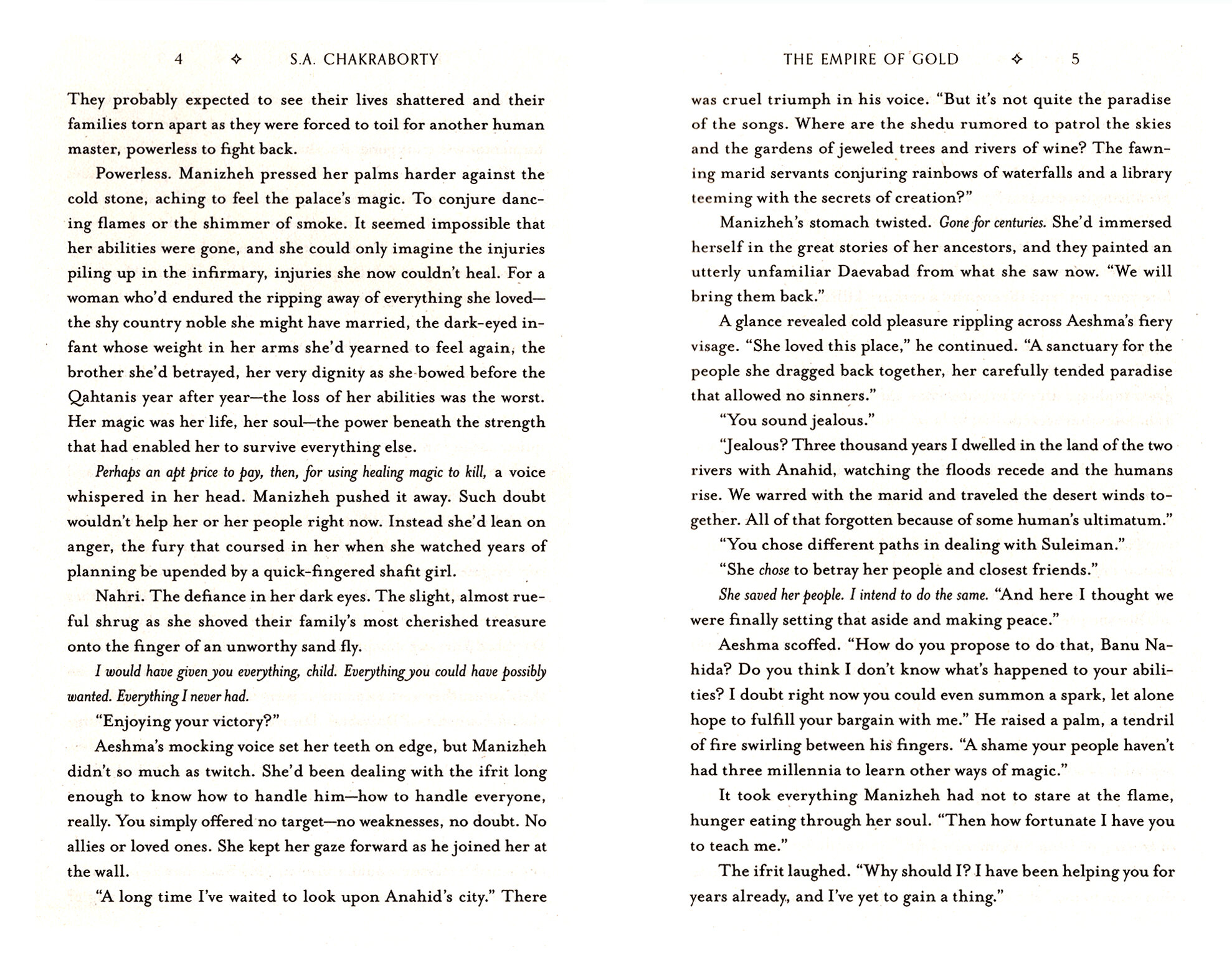 “Латунный город” отправил меня в потрясающее путешествие. “Медное королевство” привело меня на развилку. “Золотая империя” вознаградила меня за мою борьбу и показала мне, что путешествие, несмотря на препятствия, того стоит.